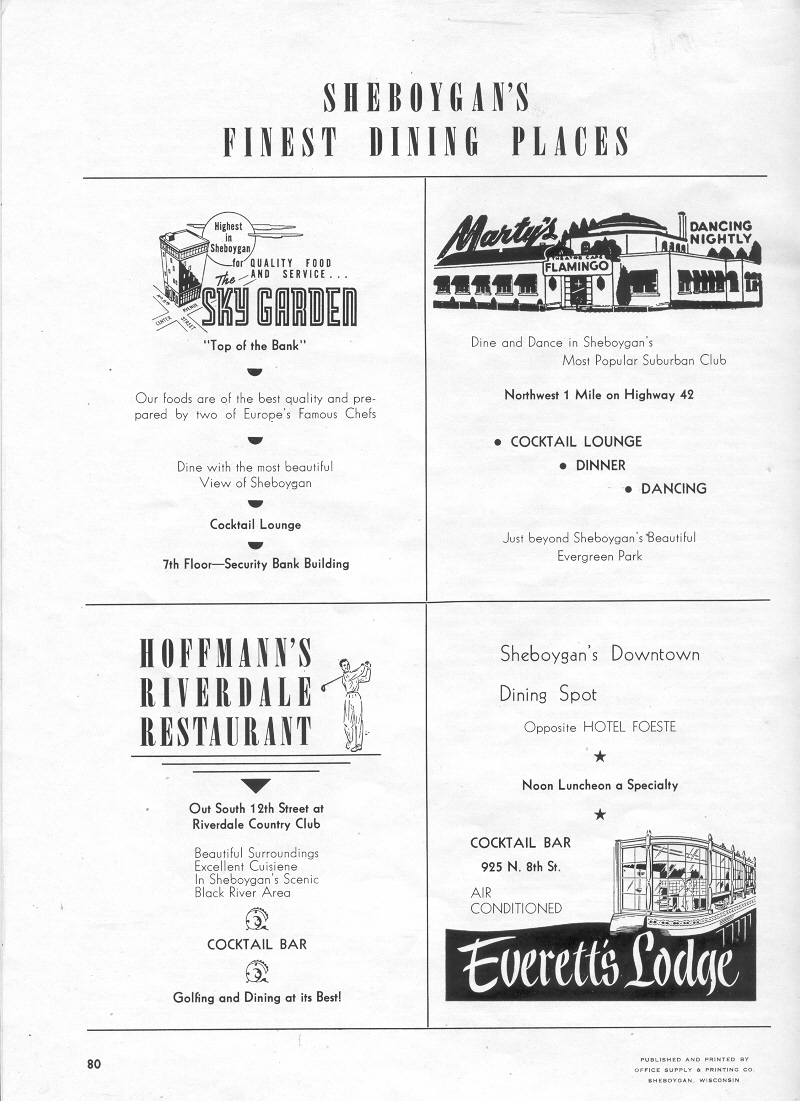 1953 Sheboygan Centennial Celebration, Page 80, Ads for Sheboygan Area Restaurants (illus.):