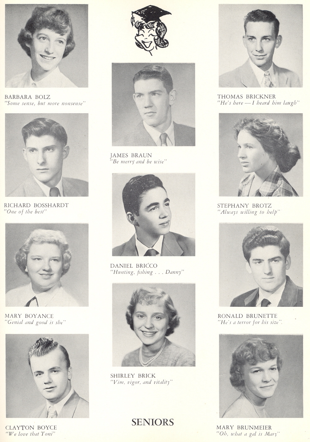 1953 Sheboygan Central High School, Page 13: Barbara Bolz, Richard Bosshardt, Mary Boyance, Clayton Boyce, James Braun, Daniel Bricco, Shirley Brick, Thomas Brickner, Stephany Brotz, Ronald Brunette, Mary Brunmeier.