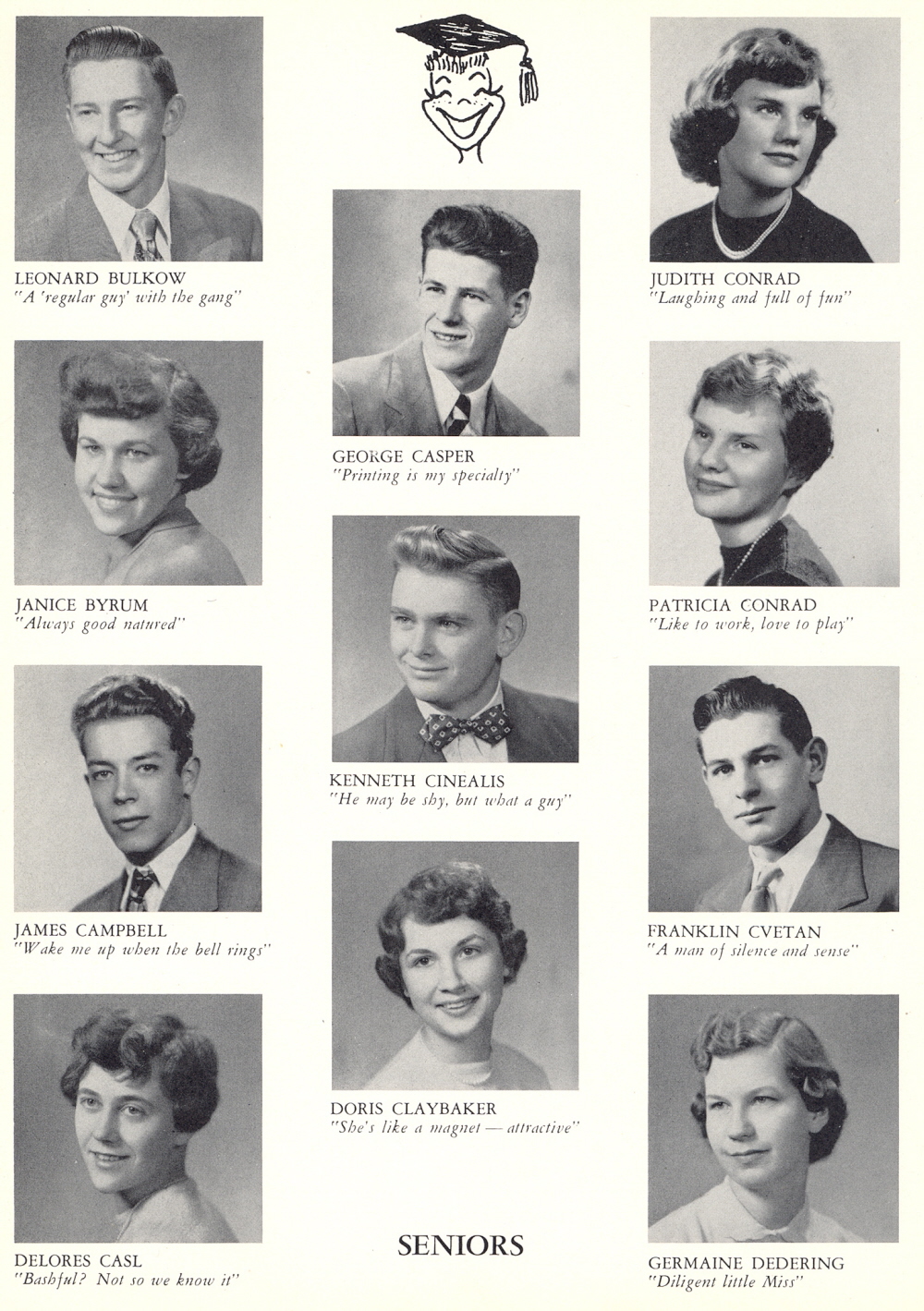 1953 Sheboygan Central High School, Page 14: Leonard Bulkow, Janice Byrum, James Campbell, Delores Casl, George Casper, Kenneth Cinealis, Doris Claybaker, Judith Conrad, Patricia Conrad, Franklin Cvetan, Germaine Dedering.