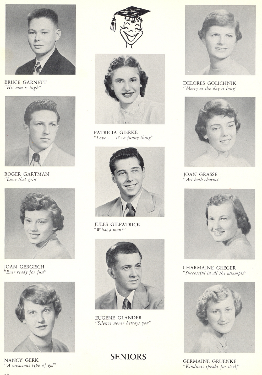 1953 Sheboygan Central High School, Page 18: Bruce Garnett, Roger Gartman, Joan Gergisch, Nancy Gerk, Patricia Gierke, Jules Gilpatrick, Eugene Glander, Delores Golichnik, Joan Grasse, Charmaine Greger, Germaine Gruenke.
