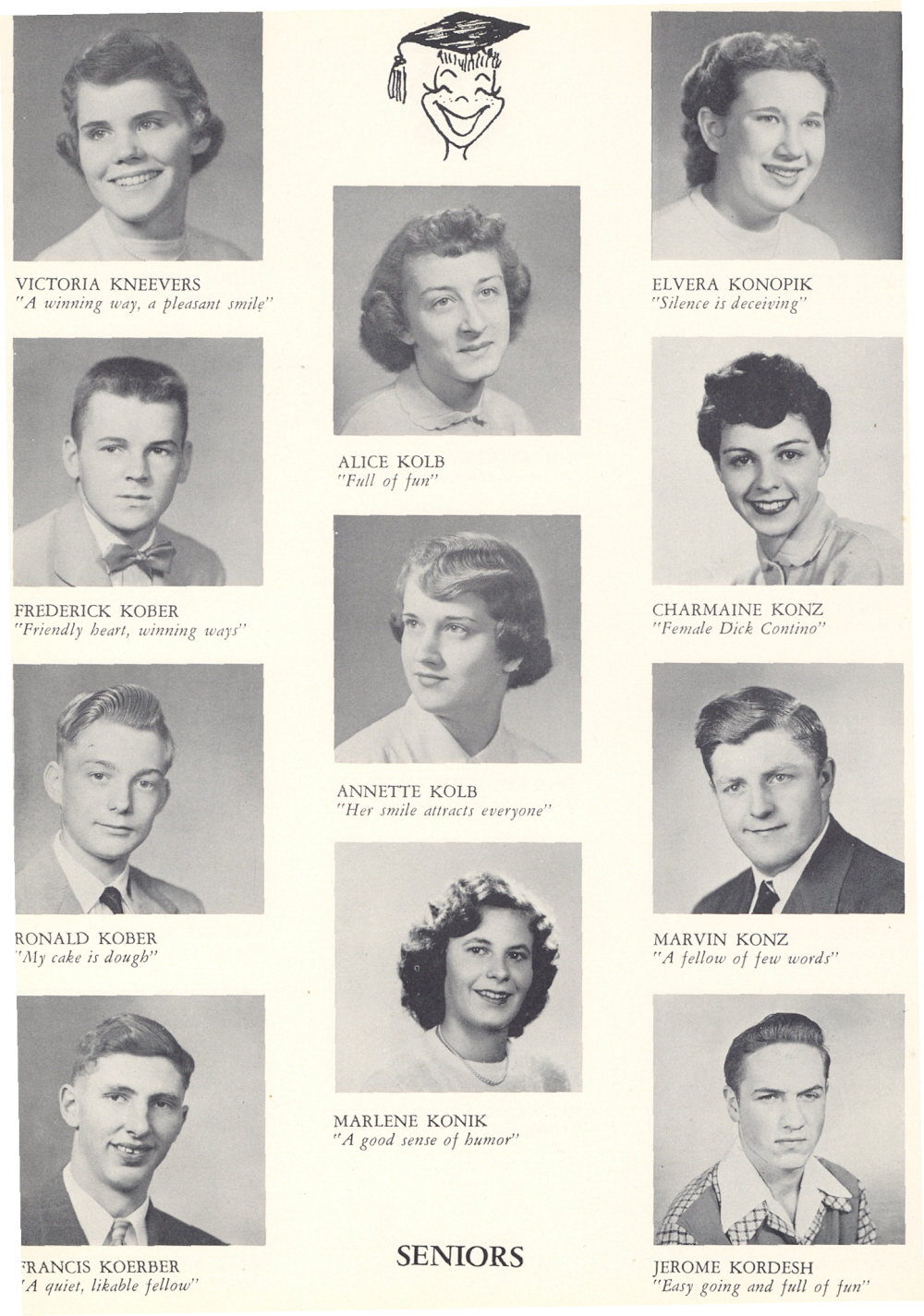 1953 Sheboygan Central High School, Page 24: Victoria Kneevers, Frederick Kober, Ronald Kober, Francis Koerber, Alice Kolb, Annette Kolb, Marlene Konik, Elvera Konopik, Charmaine Konz, Marvin Konz, Jerome Kordesh.