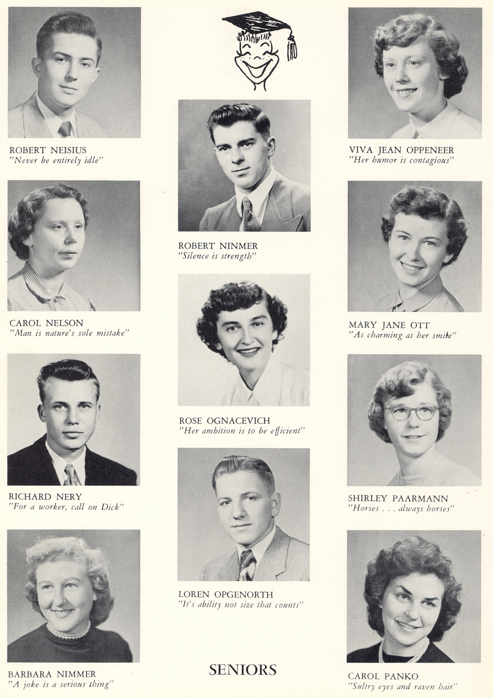 1953 Sheboygan Central High School, Page 30: Robert Neisius, Carol Nelson, Richard Nery, Barbara Nimmer, Robert Ninmer, Rose Ognacevich, Loren Opgenorth, Viva Jean Oppeneer, Mary Jane Ott, Shirley Paarmann, Carol Panko.
