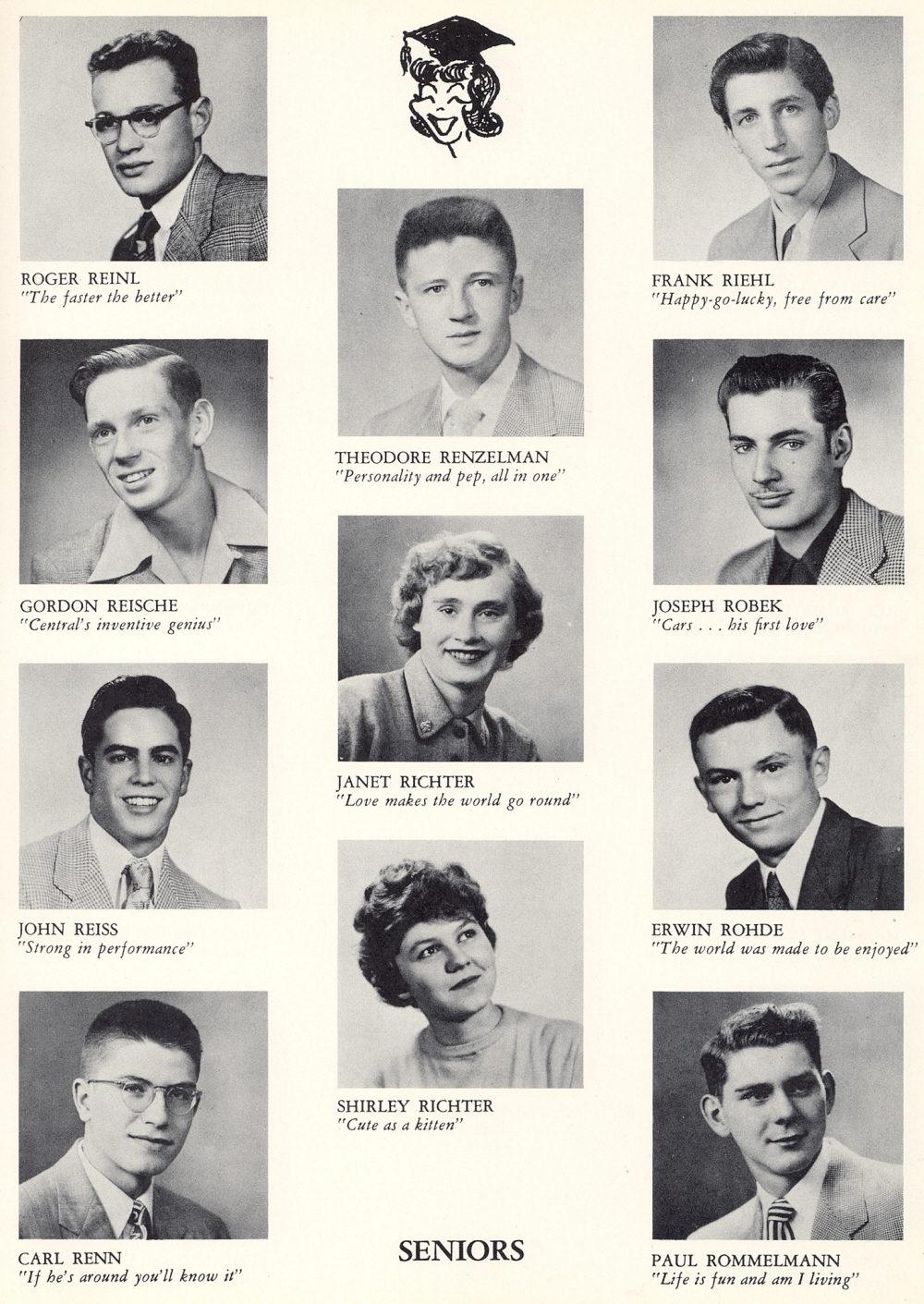 1953 Sheboygan Central High School, Page 33: Roger Reinl, Gordon Reische, John Reiss, Carol Renn, Theodore Renzelman, Janet Richter, Shirley Richter, Frank Riehl, Joseph Robek, Erwin Rohde, Paul Rommelmann.