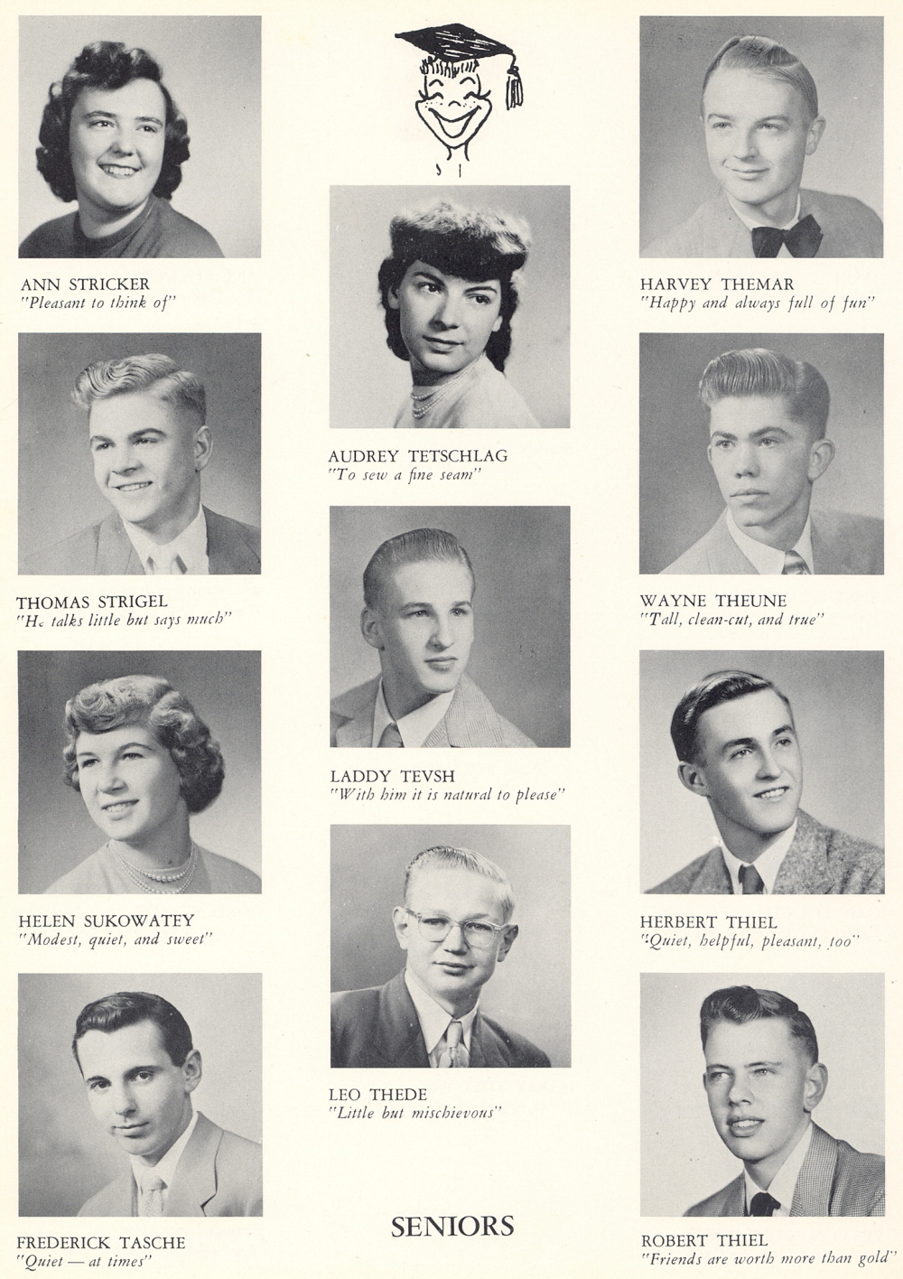 1953 Sheboygan Central High School, Page 38: Ann Stricker, Thomas Strigel, Helen Sukowatey, Frederick Tasche, Audrey Tetschlag, Laddy Tevsh, Leo Thede, Harvey Themar, Wayne Theune, Herbert Thiel, Robert Thiel.