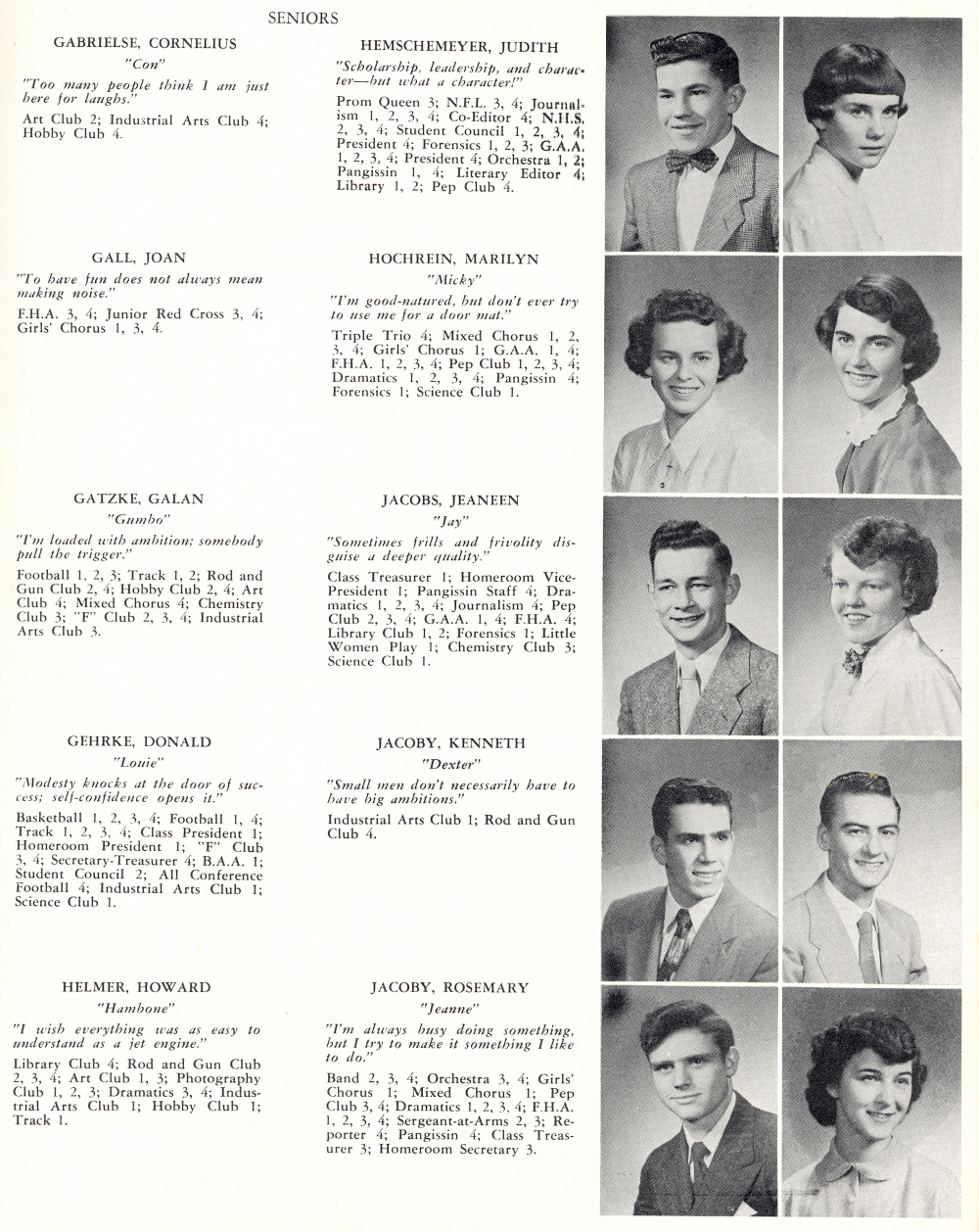 1953 Sheboygan Falls High School, Page 19: Cornelius Gabrielse, Judith Hemschemeyer, Joan Gall, Marilyn Hochrein, Galan Gatzke, Jeaneen Jacobs, Donald Gehrke, Kenneth Jacoby, Howard Helmer, Rosemary Jacoby.