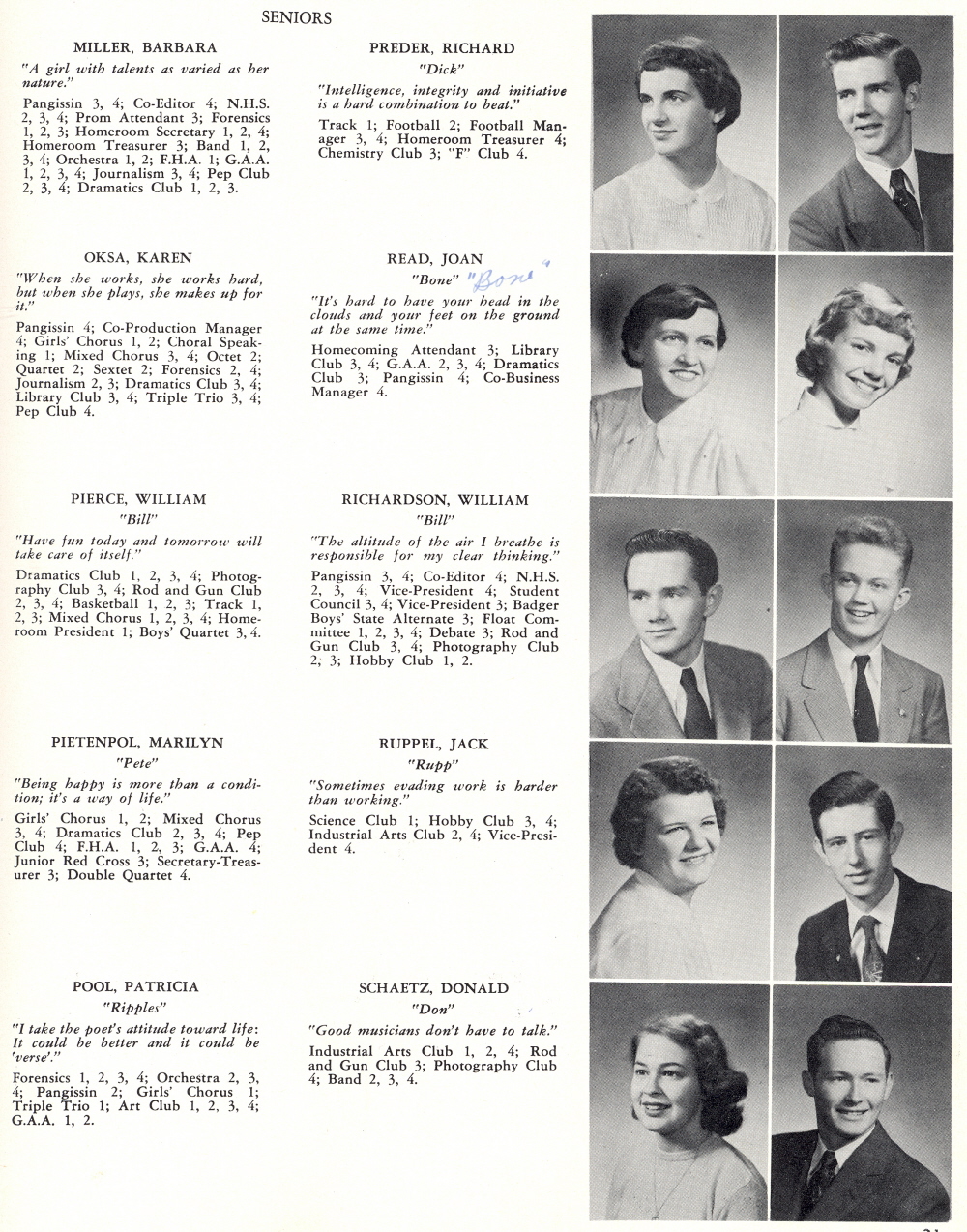 1953 Sheboygan Falls High School, Page 21: Barbara Miller, Richard Preder, Karen Oksa, Joan Read, William Pierce, William Richardson, Marilyn Pietenpol, Jack Ruppel, Patricia Pool, Donald Schaetz.