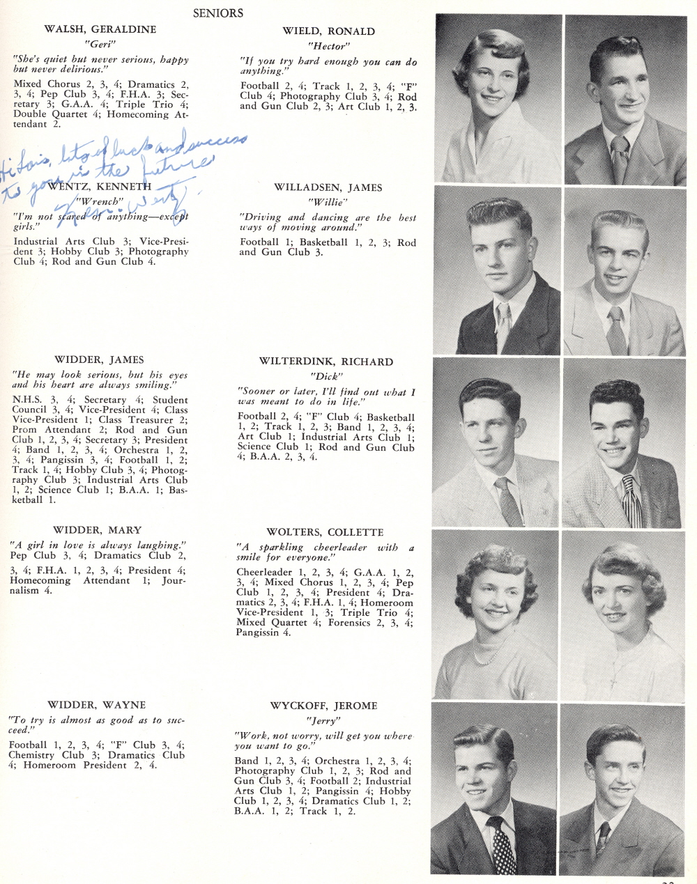 1953 Sheboygan Falls High School, Page 23: Geraldine Walsh, Ronald Wield, Kenneth Wentz, James Willadsen, James Widder, Richard Wilterdink, Mary Widder, Collette Wolters, Wayne Widder, Jerome Wyckoff.