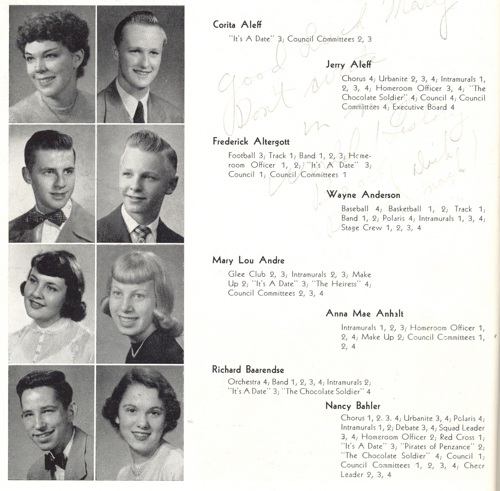 1953 Sheboygan North High School, Page 18: Corita Aleff, Jerry Aleff, Frederick Altergott, Wayne Anderson, Mary Lou Andre, Anna Mae Anhalt, Richard Baarendse, Nancy Bahler.