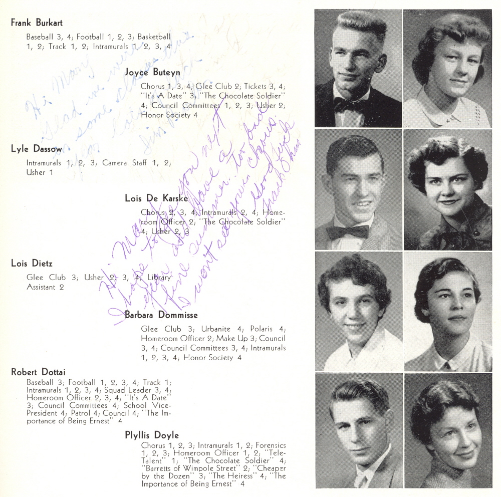 1953 Sheboygan North High School, Page 21: Frank Burkart, Joyce Buteyn, Lyle Dassow, Lois De Karske, Lois Dietz, Barbara Dommisse, Robert Dottai, Plyllis Doyle.