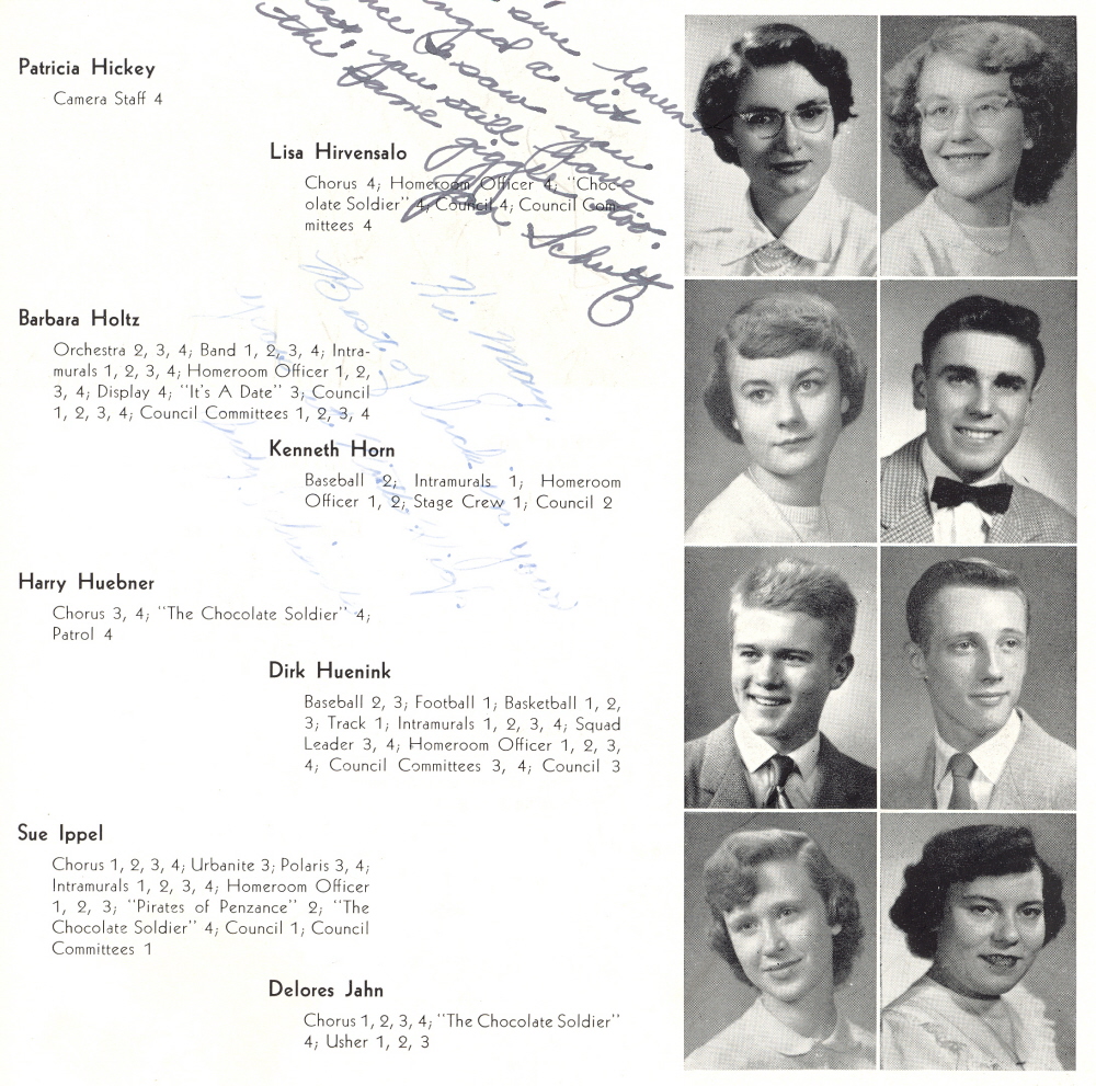 1953 Sheboygan North High School, Page 25: Patricia Hickey, Lisa Hirvensalo, Barbara Holtz, Kenneth Horn, Harry Huebner, Dirk Huenink, Sue Ippel, Delores Jahn.
