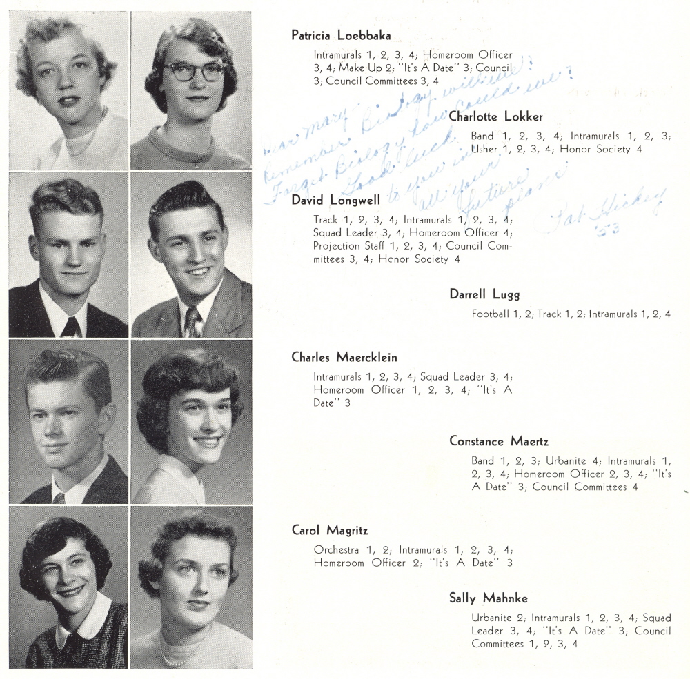 1953 Sheboygan North High School, Page 28: Patricia Loebbaka, Charlotte Lokker, David Longwell, Darrell Lugg, Charles Maercklein, Constance Maertz, Carol Magritz, Sally Mahnke.