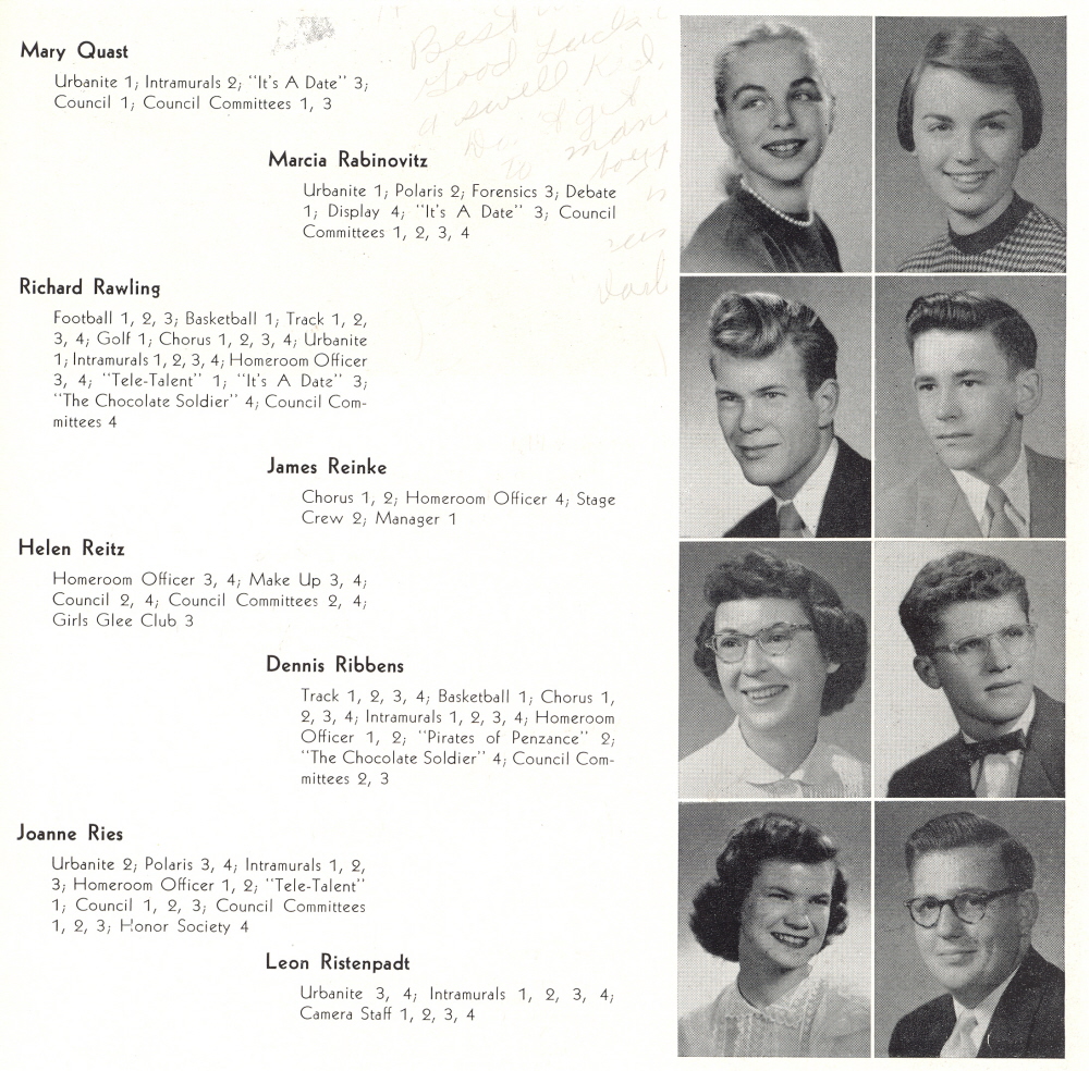1953 Sheboygan North High School, Page 33: Mary Quast, Marcia Rabinovitz, Richard Rawling, James Reinke, Helen Reitz, Dennis Ribbens, Joanne Ries, Leon Ristenpadt.