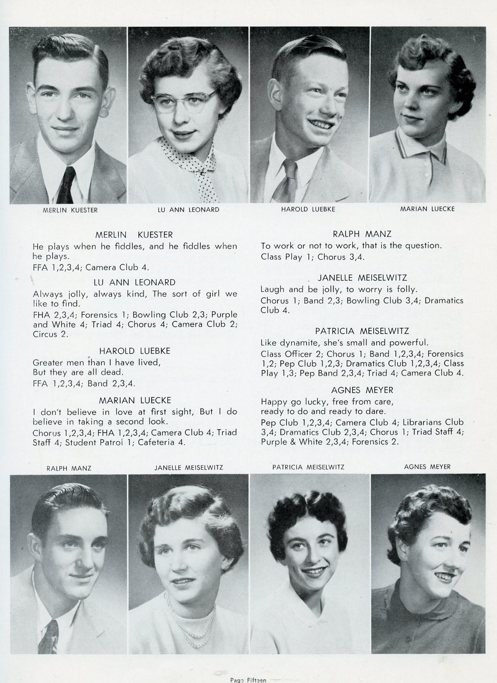 1954 Kiel High School, Page 15: Merlin Kuester, Lu Ann Leonard, Harold Luebke, Marian Luecke, Ralph Manz, Janelle Meiselwitz, Patricia Meiselwitz, Agnes Meyer.