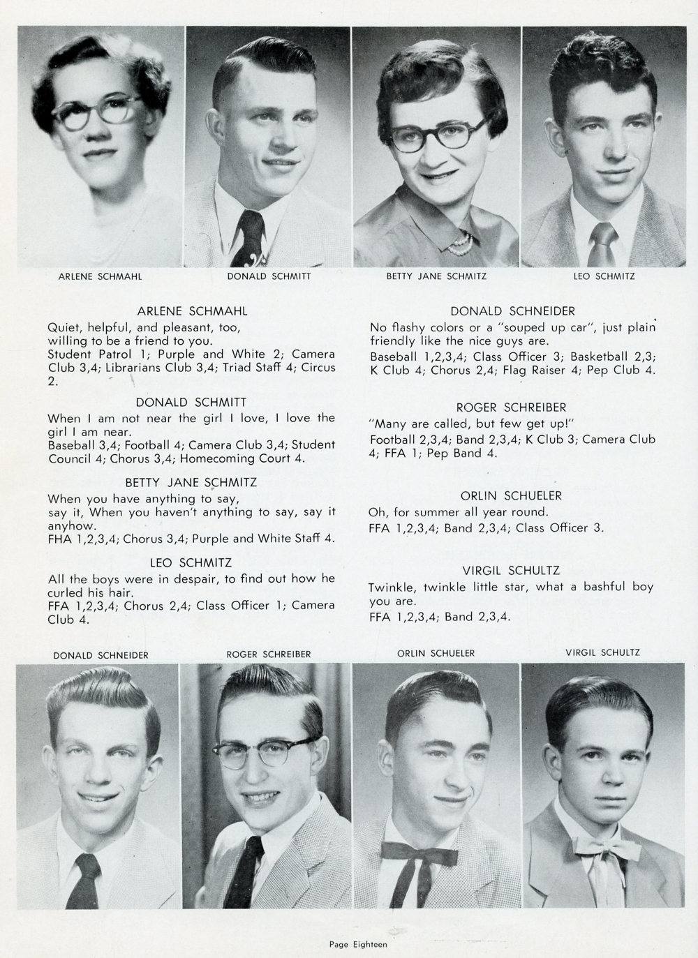 1954 Kiel High School, Page 18: Arlene Schmahl, Donald Schmitt, Betty Jane Schmitz, Leo Schmitz, Donald Schneider, Roger Schreiber, Orlin Schueler, Virgil Schultz.