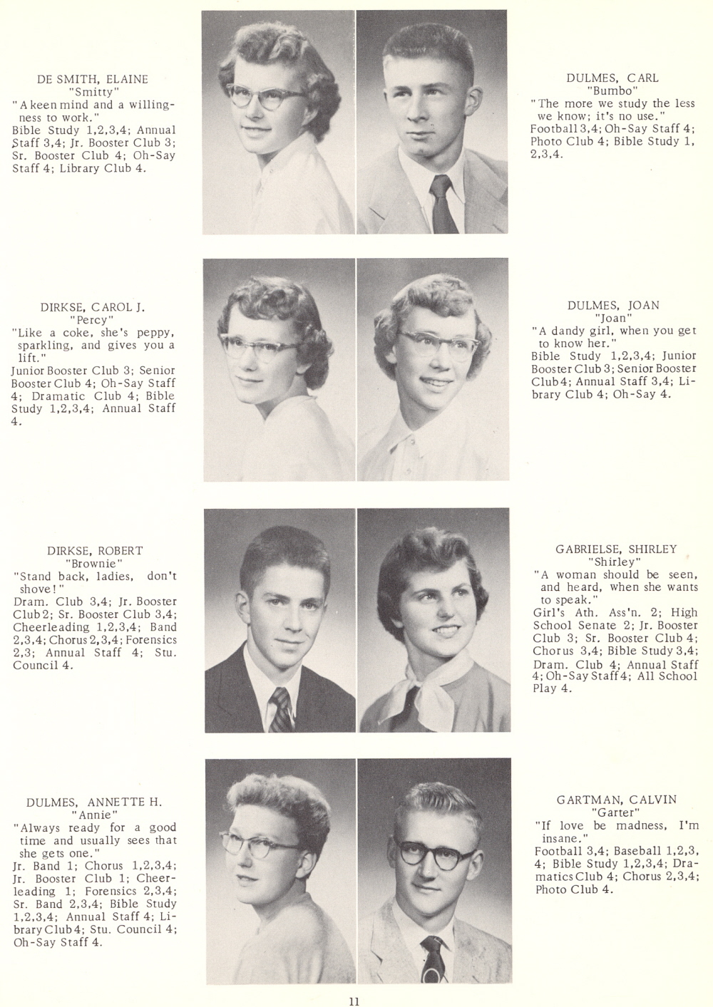 1954 Oostburg High School, Page 11: Elaine De Smith, Carol Dirkse, Robert Dirkse, Annette Dulmes, Carl Dulmes, Joan Dulmes, Shirley Gabrielse, Calvin Gartman.