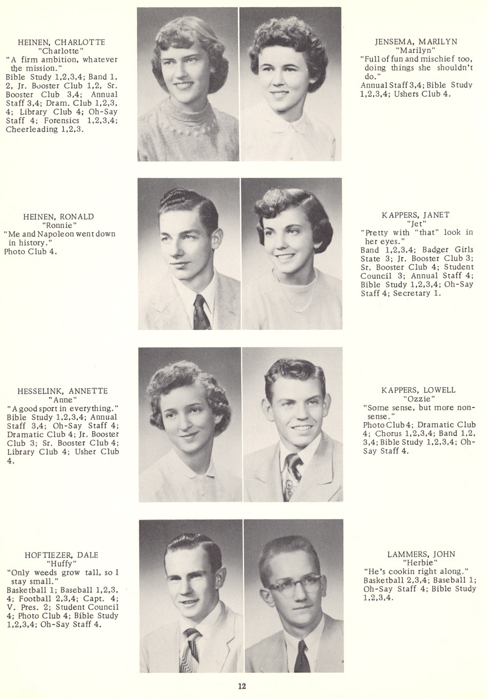 1954 Oostburg High School, Page 12: Charlotte Heinen, Ronald Heinen, Annette Hesselink, Dale Hoftiezer, Marilyn Jensema, Janet Kappers, Lowell Kappers, John Lammers.
