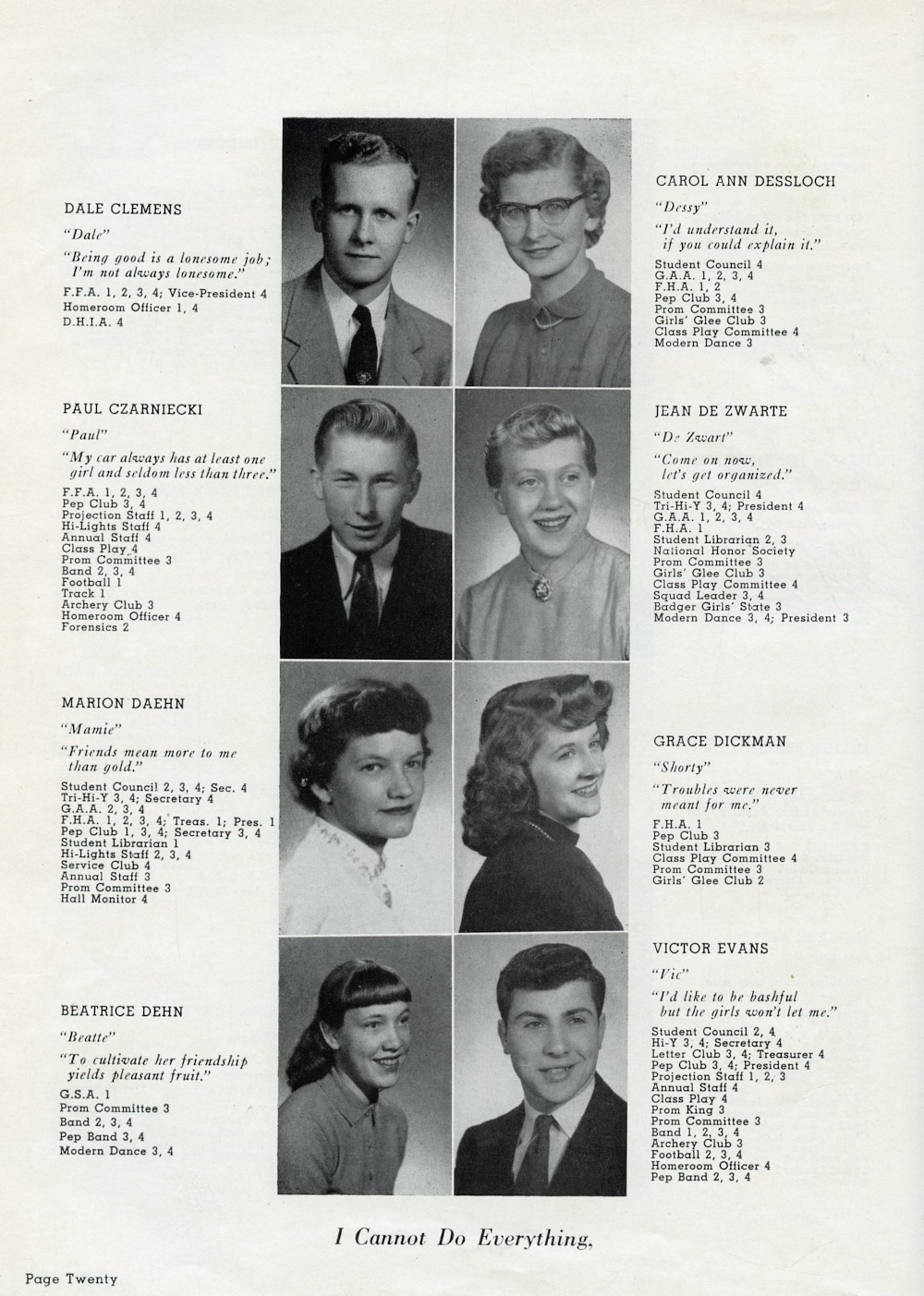 1954 Plymouth High School Yearbook Page 20: Dale Clemens, Paul Czarniecki, Marion Daehn, Beatrice Dehn, Carol Ann Dessloch, Jean De Zwarte, Grace Dickman, Victor Evans.