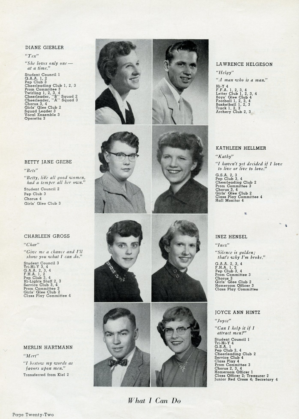 1954 Plymouth High School Yearbook Page 22: Diane Giebler, Betty Jane Grebe, Charleen Gross, Merlin Hartmann, Lawrence Helgeson, Kathleen Hellmer, Inez Hensel, Joyce Ann Hintz.