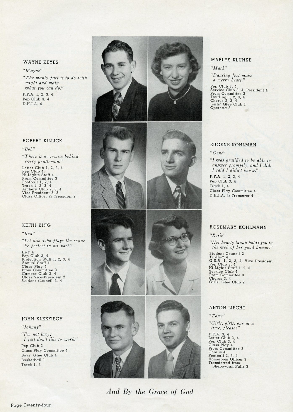 1954 Plymouth High School Yearbook Page 24: Wayne Keyes, Robert Killick, Keith King, John Kleefisch, Marlys Klunke, Eugene Kohlman, Rosemary Kohlmann, Anton Leicht.