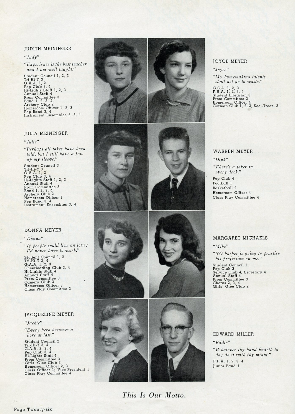 1954 Plymouth High School Yearbook Page 26: Judith Meininger, Julia Meininger, Donna Meyer, Jacqueline Mayer, Joyce Meyer, Warren Meyer, Margaret Michaels, Edward Miller.