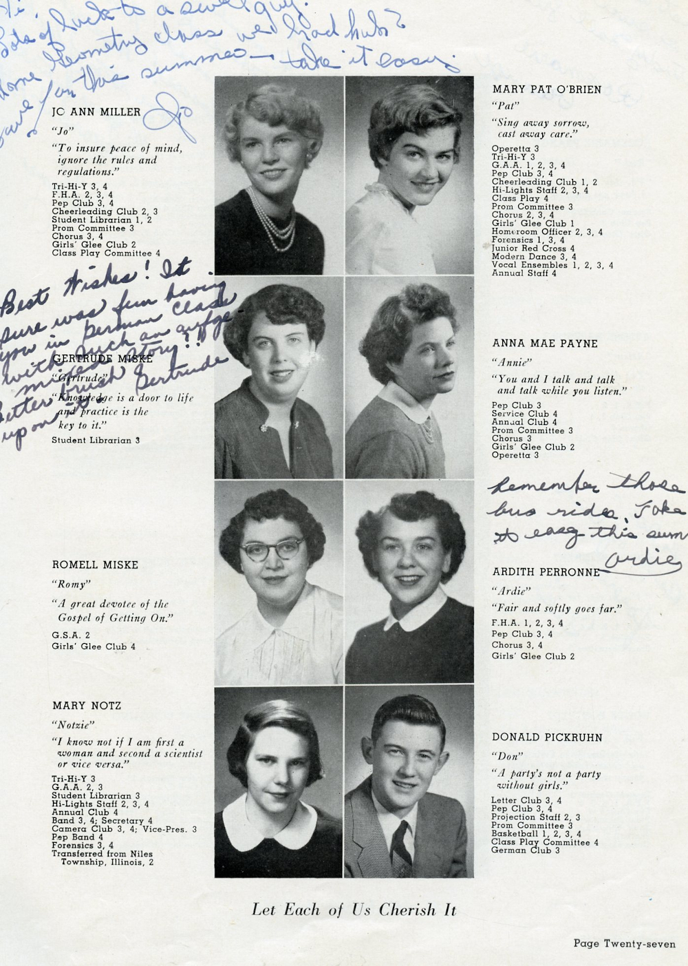 1954 Plymouth High School Yearbook Page 27: Jo Ann Miller, Gertrude Miske, Romell Miske, Mary Notz, Mary Pat O'Brien, Anna Mae Payne, Ardith Perronne, Donald Pickruhn.