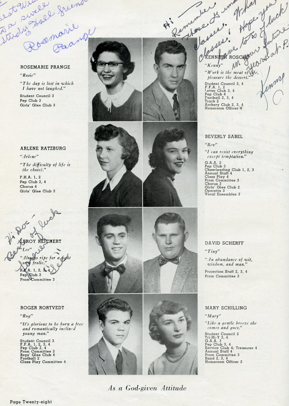 1954 Plymouth High School Yearbook Page 28: Rosemarie Prange, Arlene Ratzburg, Leroy Reichert, Roger Rortvedt, Kenneth Rosche, Beverly Sabel, David Scherff, Mary Schilling.