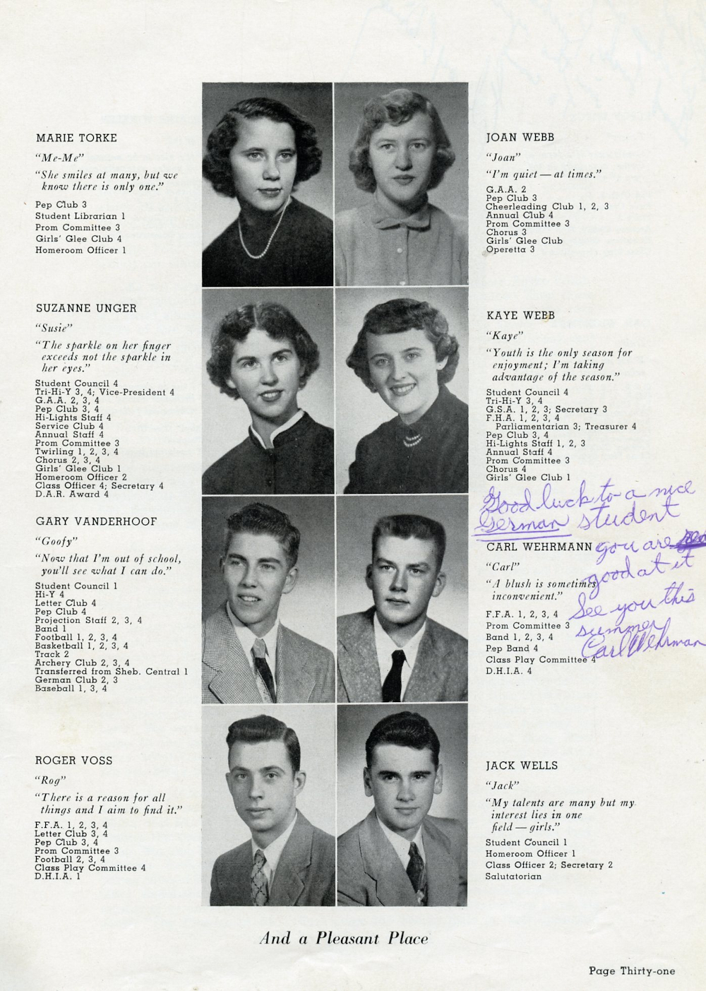 1954 Plymouth High School Yearbook Page 31: Marie Torke, Suzanne Unger, Gary Vanderhoof, Roger Voss, Joan Webb, Kaye Webb, Carl Wehrmann, Jack Wells.
