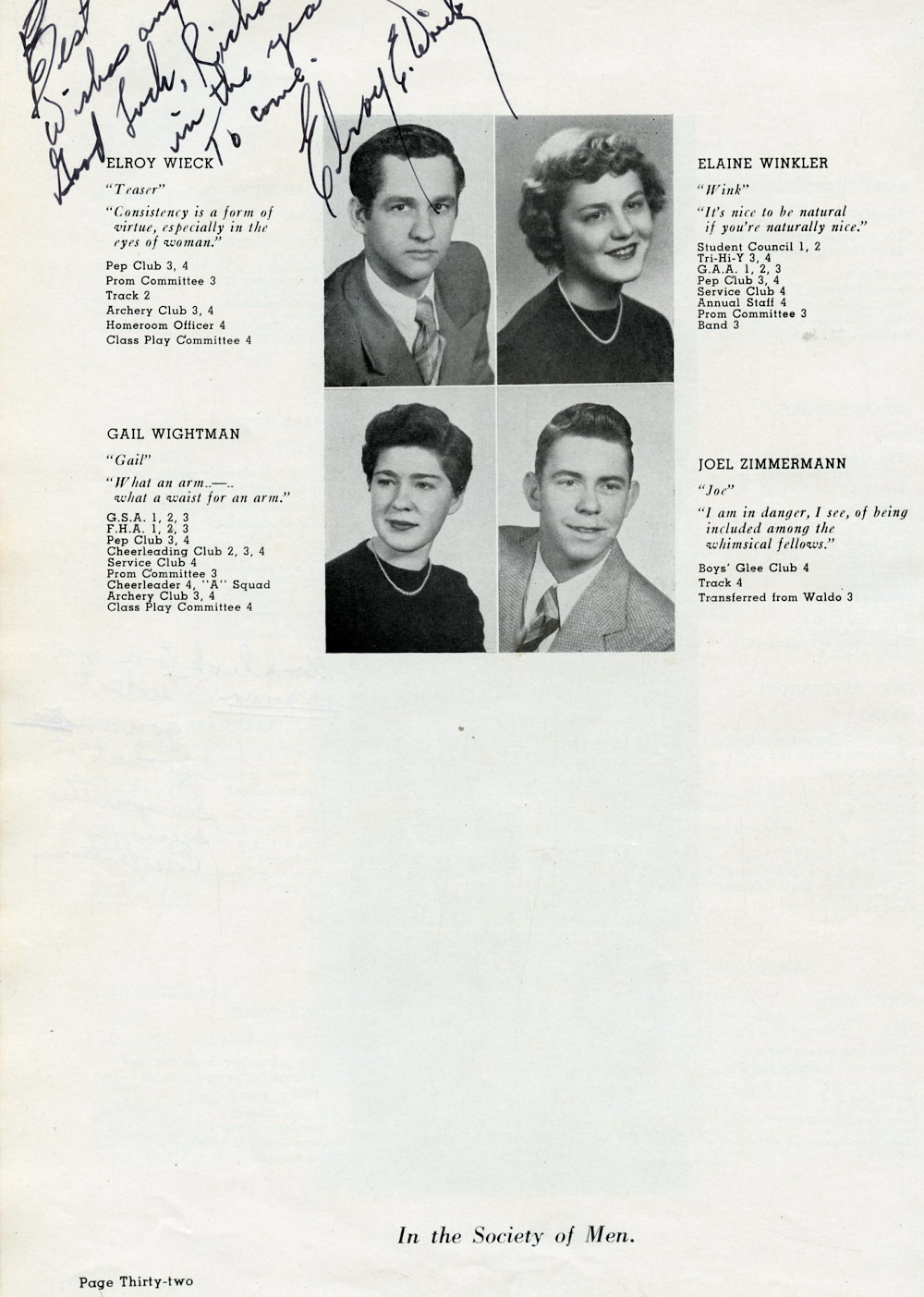 1954 Plymouth High School Yearbook Page 32: Elroy Wieck, Gail Wightman, Elaine Winkler, Joel Zimmermann.