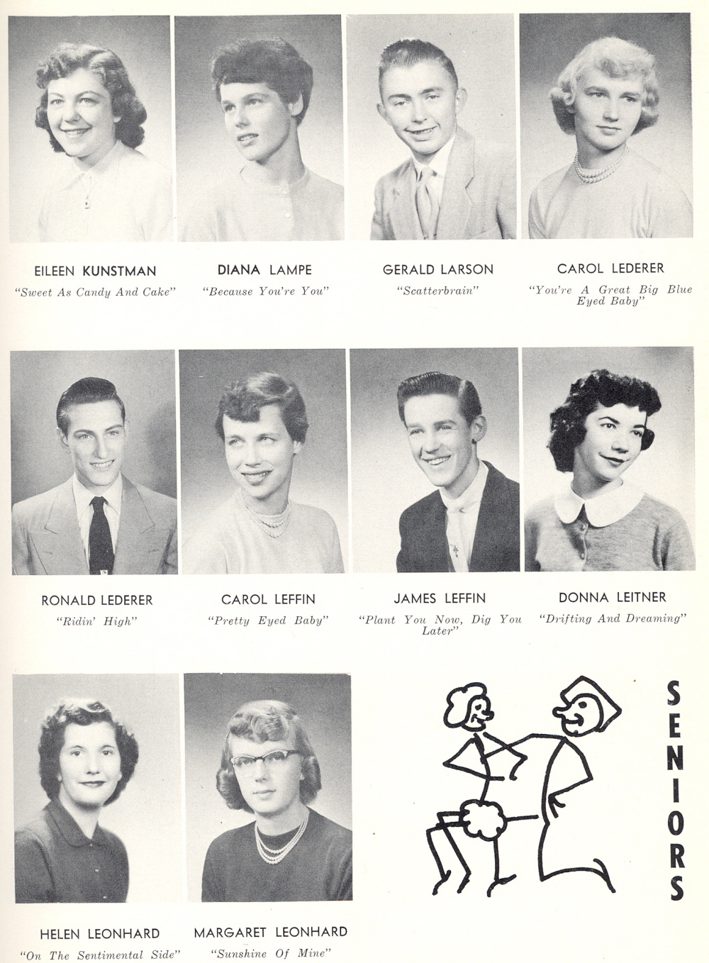 1954 Sheboygan Central High School, Page 39: Eileen Kunstman, Diana Lampe, Gerald Larson, Carol Lederer, Ronald Lederer, Carol Leffin, James Leffin, Donna Leitner, Helen Leonhard, Margaret Leonhard.