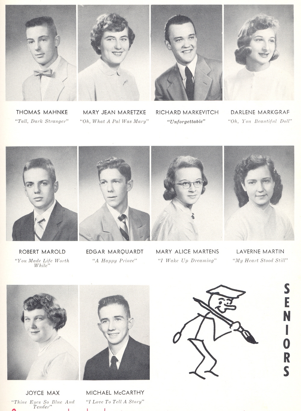 1954 Sheboygan Central High School, Page 41: Thomas Mahnke, Mary Maretzke, Richard Markevitch, Darlene Markgraf, Robert Marold, Edgar Marquardt, Mary Martens, LaVerne Martin, Joyce Max, Michael McCarthy.