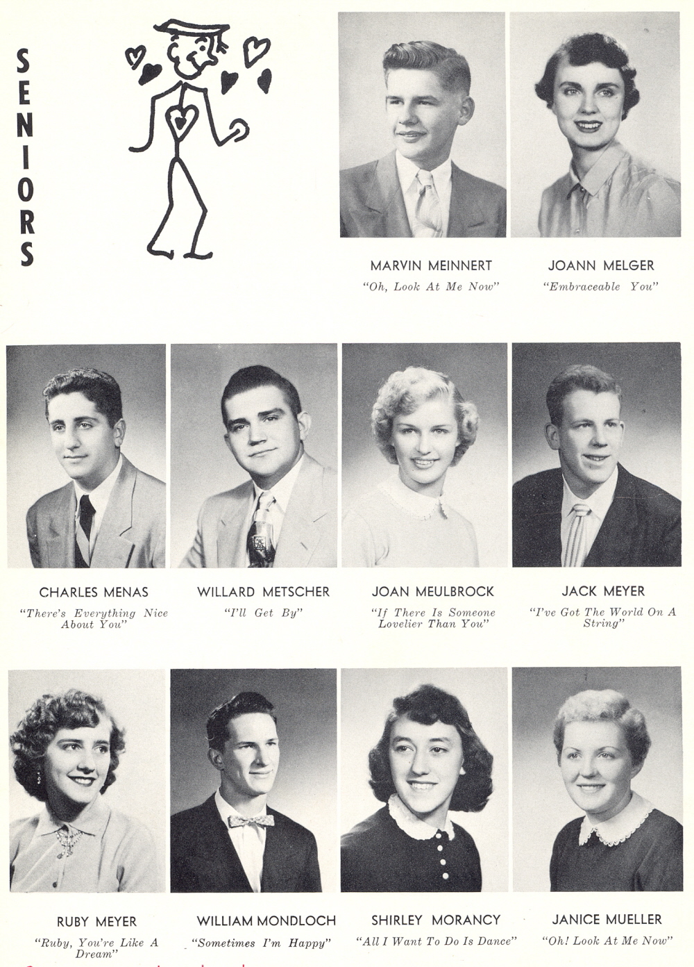1954 Sheboygan Central High School, Page 42: Marvin Meinnert, Joann Melger, Charles Menas, Willard Metscher, Joan Meulbrock, Jack Meyer, Ruby Meyer, William Mondloch, Shirley Morancy, Janice Mueller.