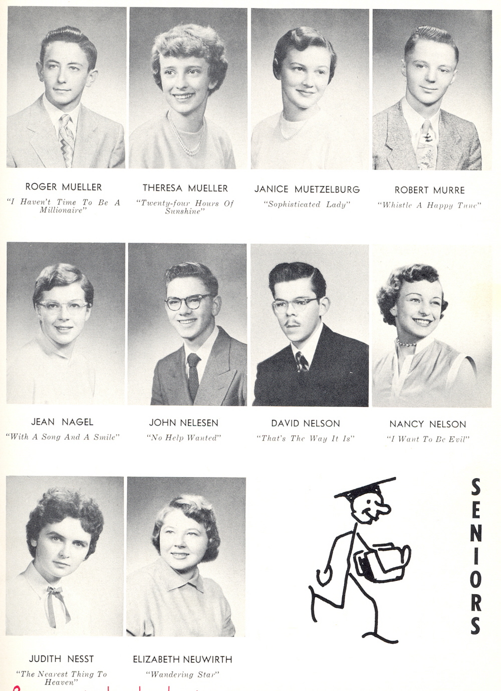 1954 Sheboygan Central High School, Page 43: Roger Mueller, Theresa Mueller, Janice Muetzelburg, Robert Murre, Jean Nagel, John Nelesen, David Nelson, Nancy Nelson, Judith Nesst, Elizabeth Neuwirth.
