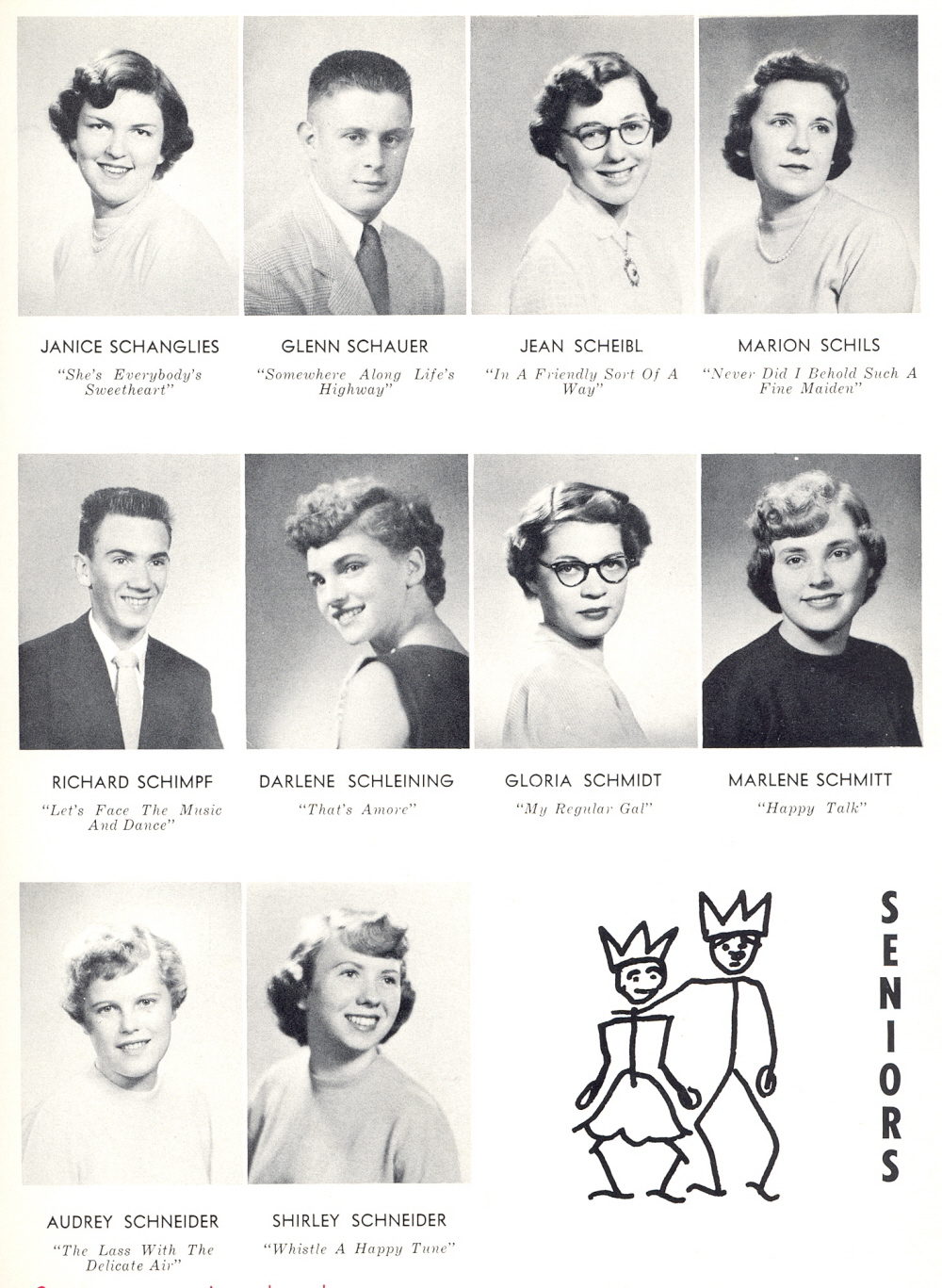 1954 Sheboygan Central High School, Page 49: Janice Schanglies, Glenn Schauer, Jean Scheibl, Marion Schils, Richard Schimpf, Darlene Schleining, Gloria Schmidt, Marlene Schmitt, Audrey Schneider, Shirley Schneider.