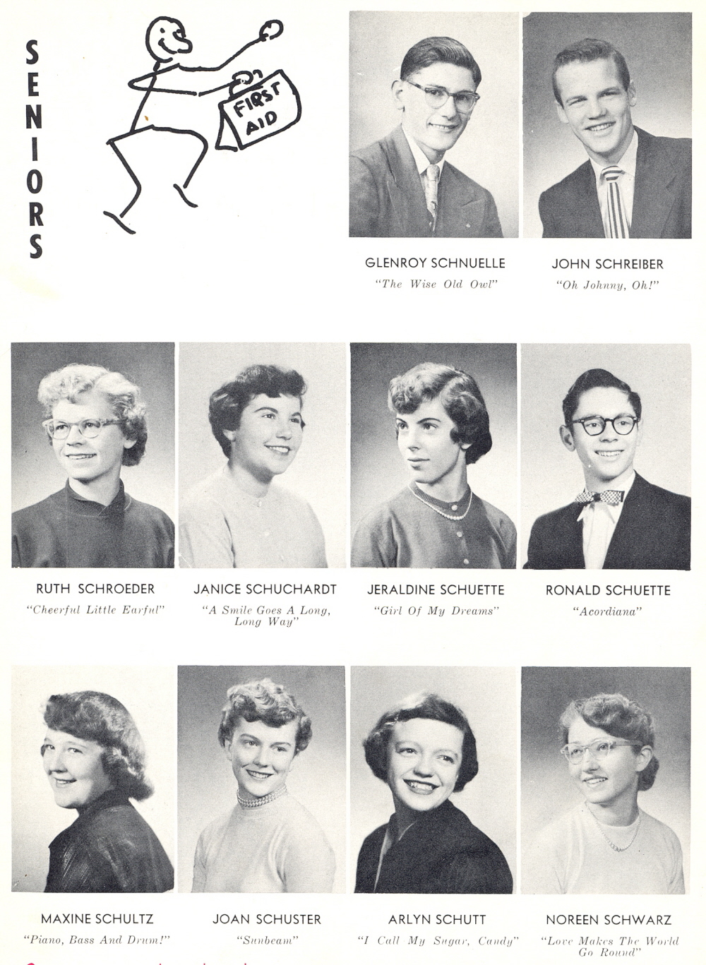 1954 Sheboygan Central High School, Page 50: Glenroy Schnuelle, John Schreiber, Ruth Schroeder, Janice Schuchardt, Jeraldine Schuette, Ronald Schuette, Maxine Schultz, Joan Schuster, Arlyn Schutt, Noreen Schwarz.