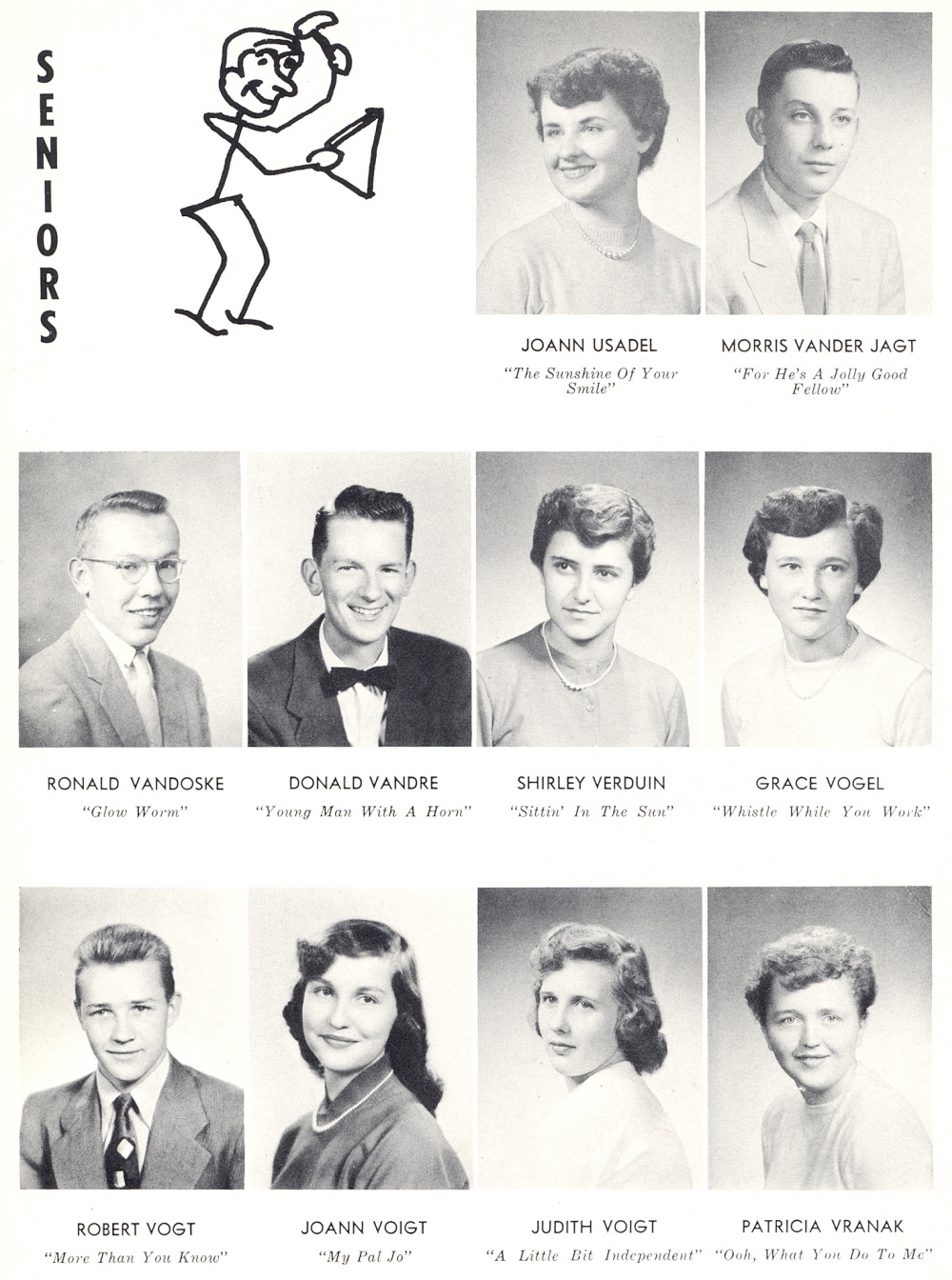 1954 Sheboygan Central High School, Page 54: Joann Usadel, Morris Vander Jagt, Ronald Vandoske, Donald Vandre, Shirley Verduin, Grace Vogel, Robert Vogt, Joann Voigt, Judith Voigt, Patricia Vranak.