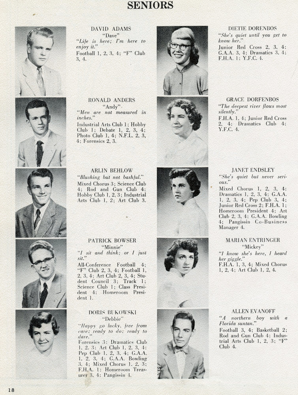1954 Sheboygan Falls High School Yearbook Page 18: David Adams, Ronald Anders, Arlin Behlow, Patrick Bowser, Doris Bukowski, Dietie Dorenbos, Crace Dorenbos, Janet Endsley, Marian Entringer, Allen Evanoff.