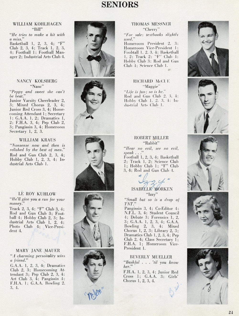 1954 Sheboygan Falls High School Yearbook Page 21: William Kohnhagen, Nancy Kolsberg, William Kraus, Le Roy Kuhlow, Mary Jane Mauer, Thomas Messner, Richafrd McCue, Robet Miller, Isabelle Morken, Beverly Mueller.