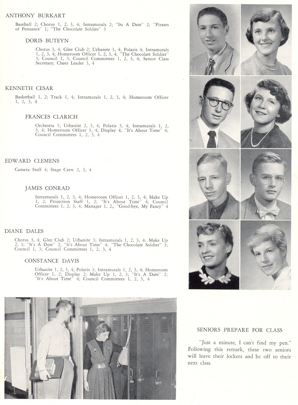 1954 Sheboygan North High School, Page 17: Anthony Burkart, Doris Buteyn, Kenneth Cesar, Frances Clarich, Edward Clemens, James Conrad, Diane Dales, Constance Davis.