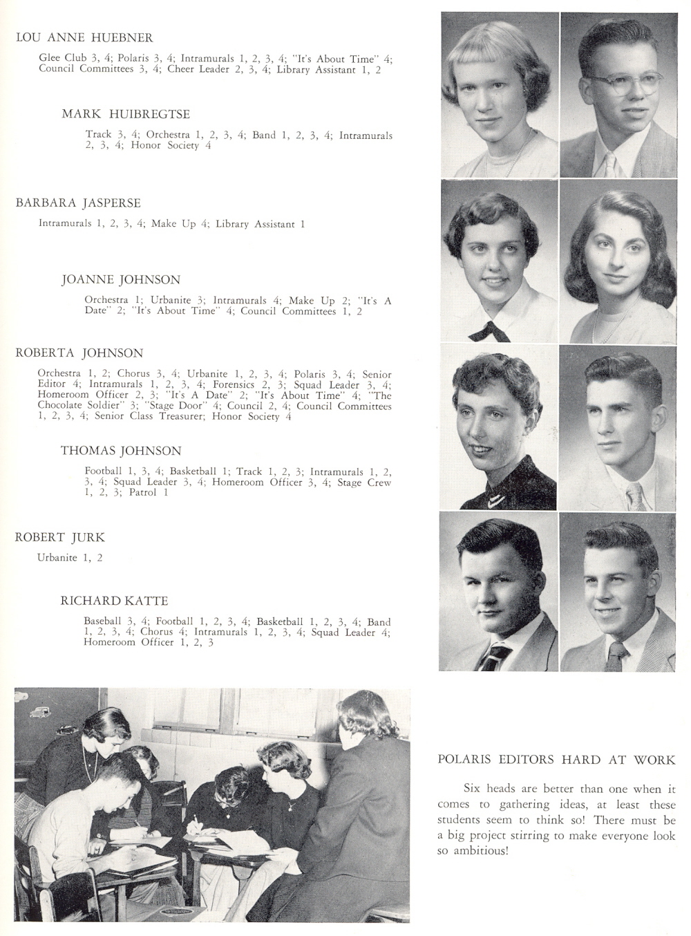 1954 Sheboygan North High School, Page 25: Lou Anne Huebner, Mark Huibregtse, Barbara Jasperse, Joanne Johnson, Roberta Johnson, Thomas Johnson, Roberk Jurk, Richard Katte.