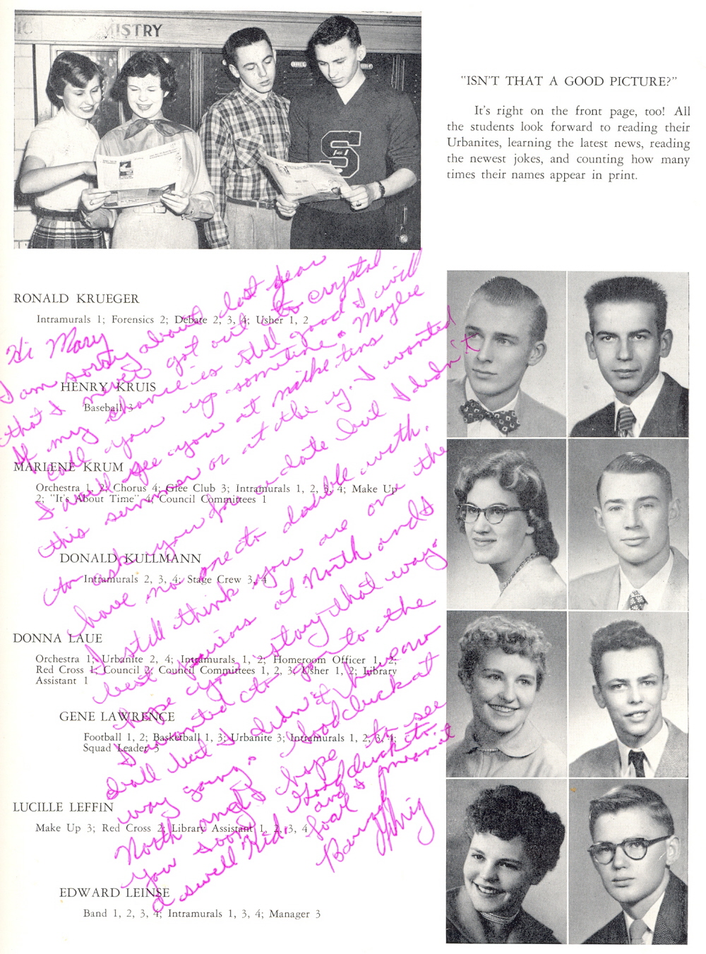 1954 Sheboygan North High School, Page 27: Ronald Krueger, Henry Kruis, Marlene Krum, Donald Kullmann, Donna Laue, Gene Lawrence, Lucille Leffin, Edward Leinse.