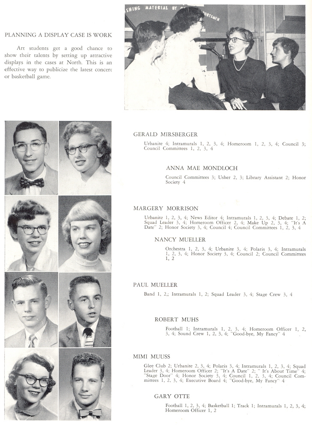 1954 Sheboygan North High School, Page 30: Gerald Mirsberger, Anna Mae Mondloch, Margery Morrison, Nancy Mueller, Paul Mueller, Robert Muhs, Mimi Muuss, Gary Otte.