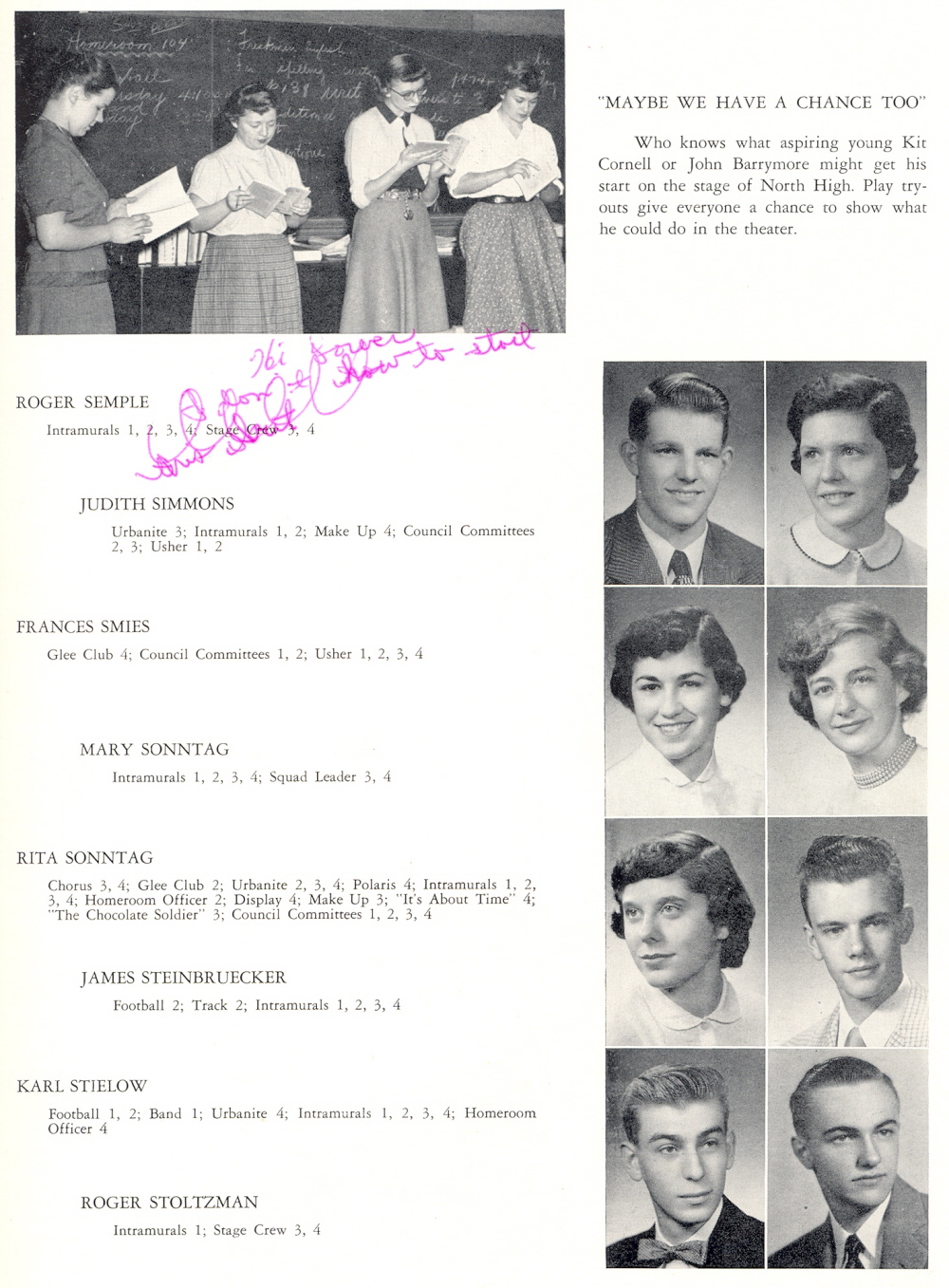 1954 Sheboygan North High School, Page 35: Roger Semple, Judith Simmons, Frances Smies, Mary Sonntag, Rita Sonntag, James Steinbruecker, Karl Stielow, Roger Stoltzman.
