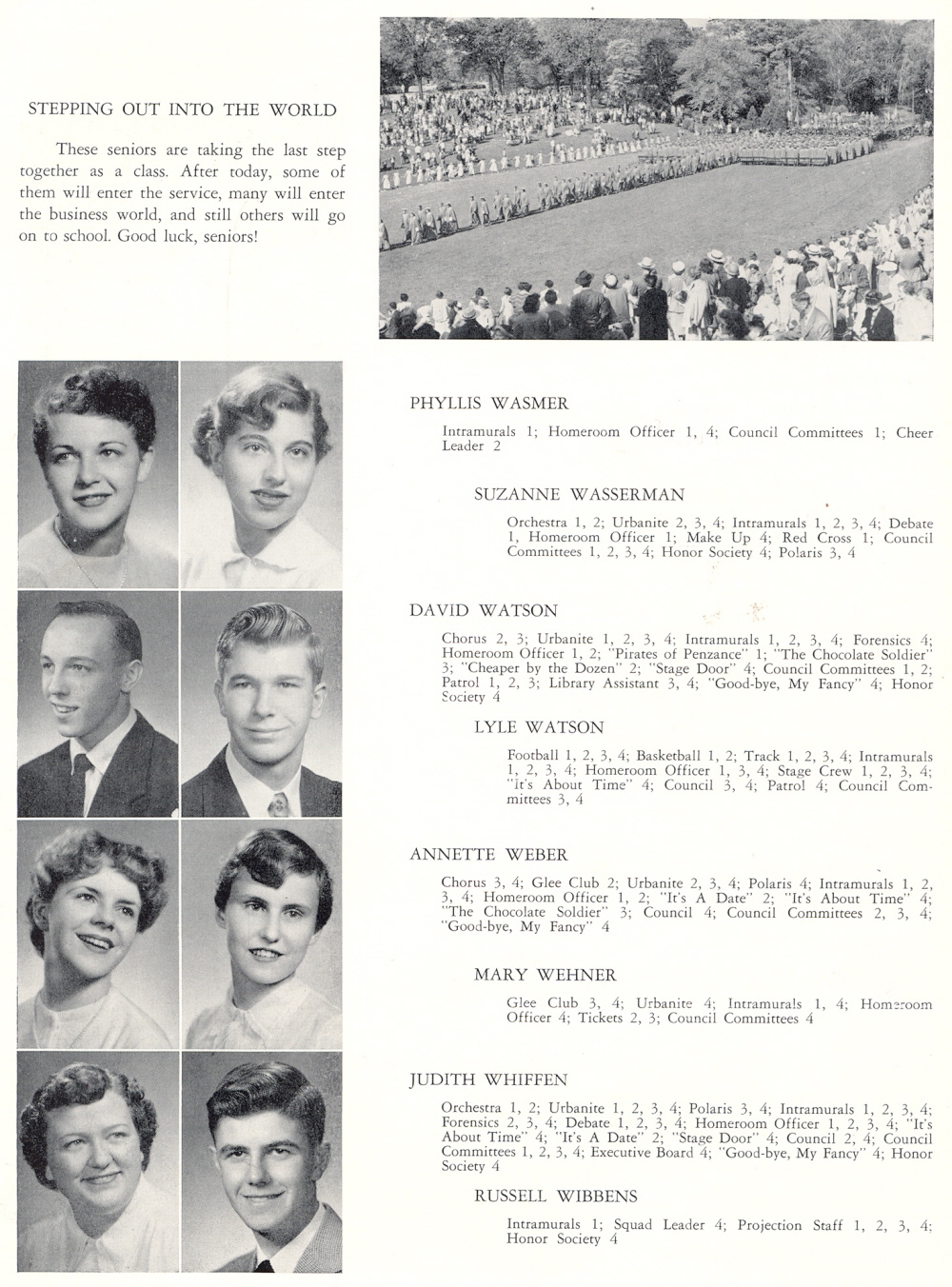1954 Sheboygan North High School, Page 38: Phyllis Wasmer, Suzanne Wasserman, David Watson, Lyle Watson, Annette Weber, Mary Wehner, Judith Whiffen, Russell Wibbens.