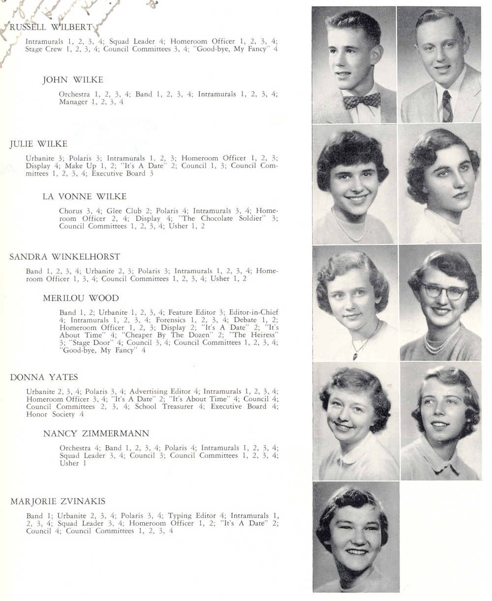 1954 Sheboygan North High School, Page 39: Russell Wilbert, John Wilke, Julie Wilke, La Vonne Wilke, Sandra Winkelhorst, Merilou Wood, Donna Yates, Nancy Zimmermann, Marjorie Zvinakis.