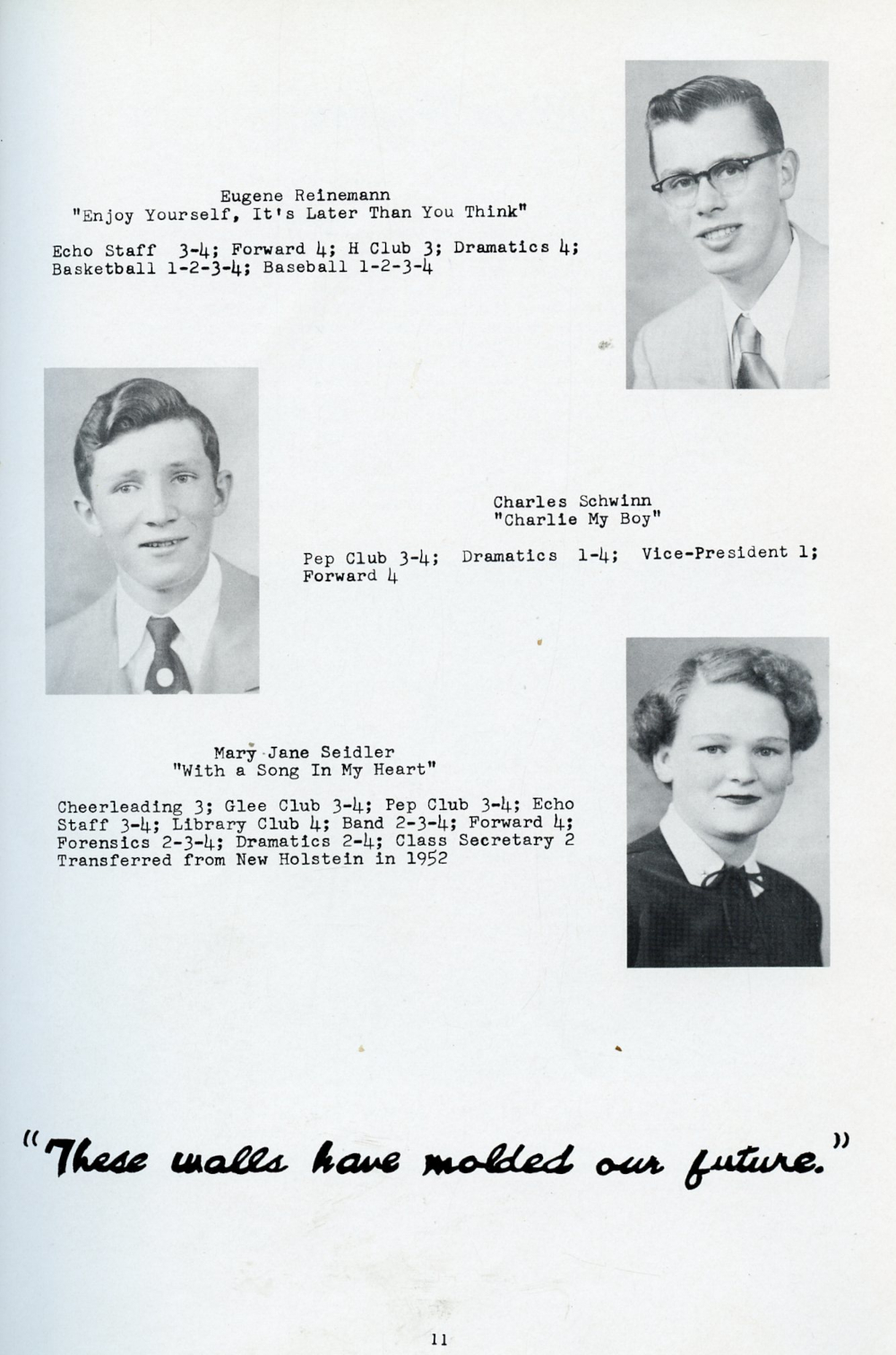 1955 Howards Grove High School Yearbook Page 11: Eugene Reinemann, Charles Schwinn, Mary Jane Seidler.