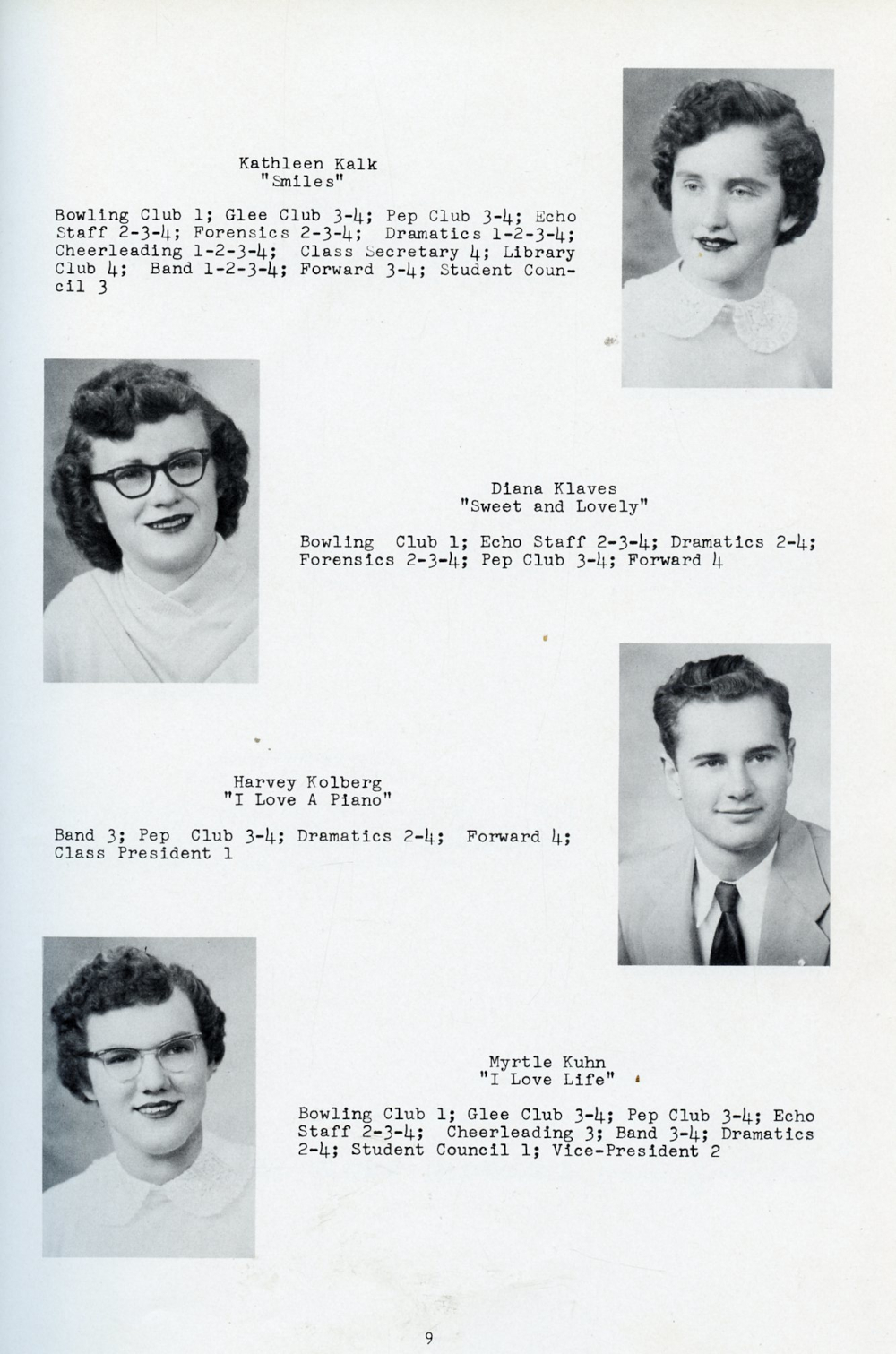 1955 Howards Grove High School Yearbook Page 9: Kathleen Kalk, Diana Klaves, Harvey Kolberg, Myrtle Kuhn.