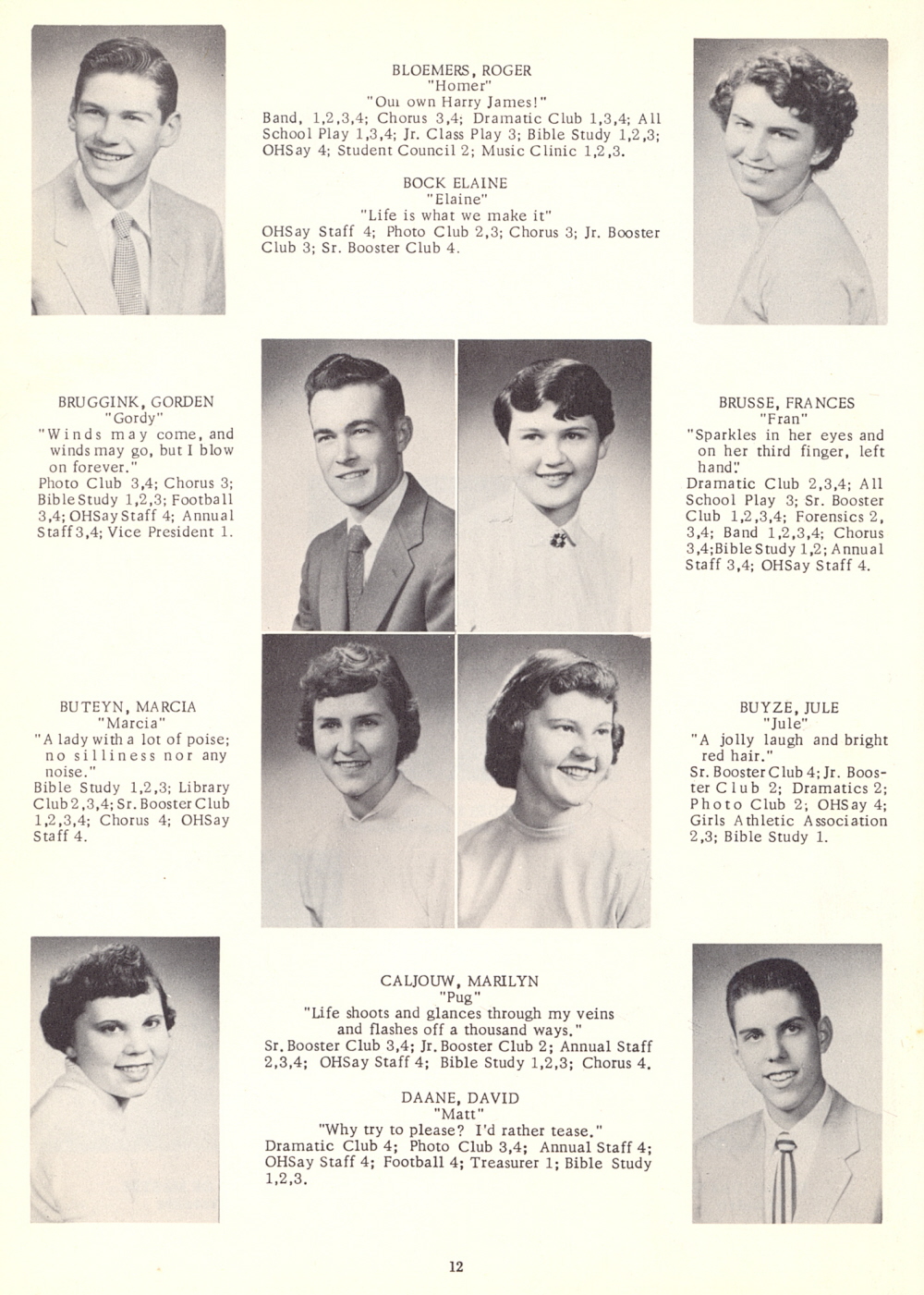 1955 Oostburg High School, Page 12: Roger Bloemers, Elaine Bock, Gorden Bruggink, Frances Brusse, Marcia Buteyn, Jule Buyze, Marilyn Caljouw, David Daane.