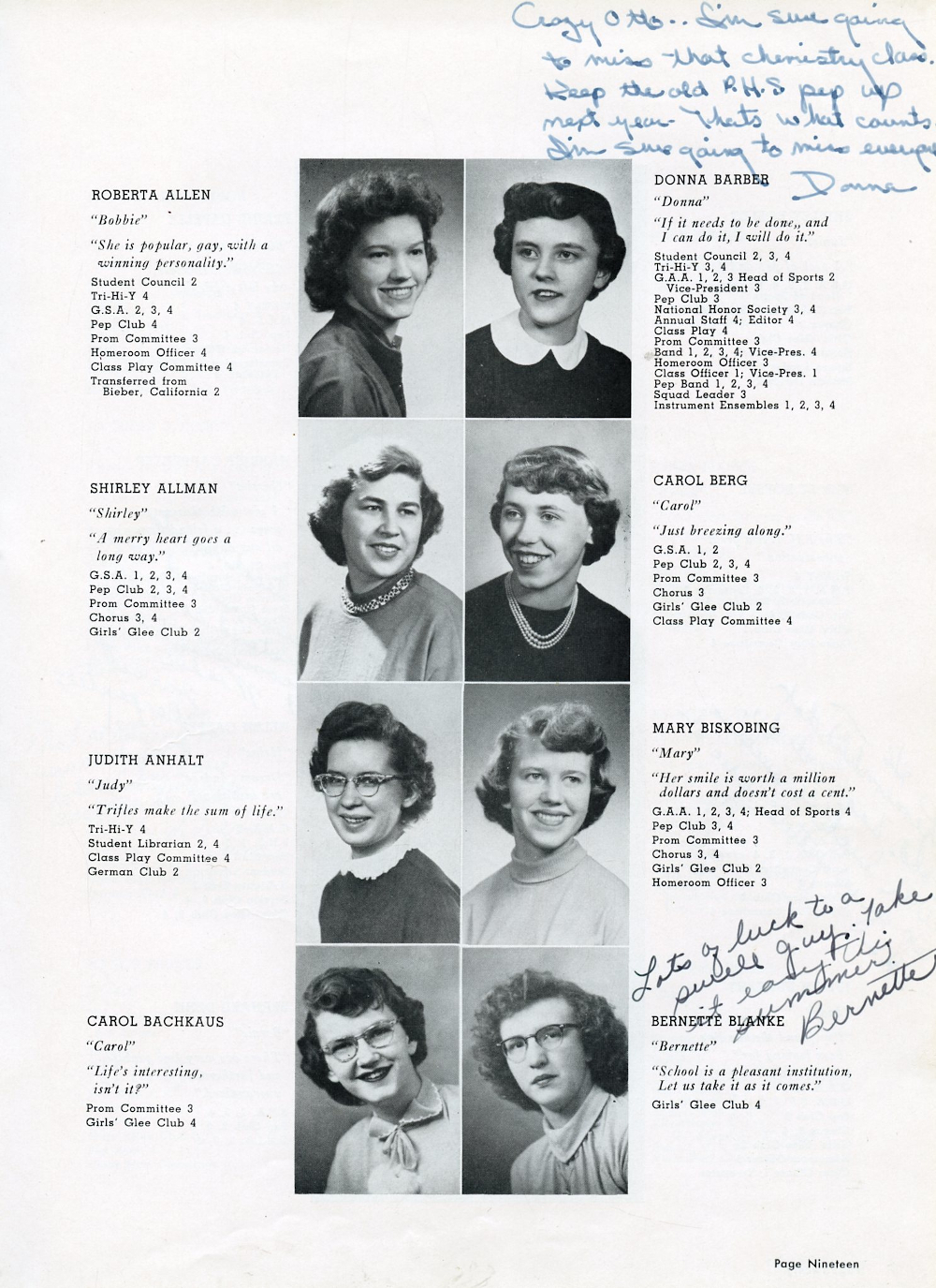 1955 Plymouth High School Page 19: Roberta Allen, Shirley Allman, judith Anhalt, Carol Bachkaus, Donna Barber, Carol Berg, Mary Biskobing, Bernette Blanke.