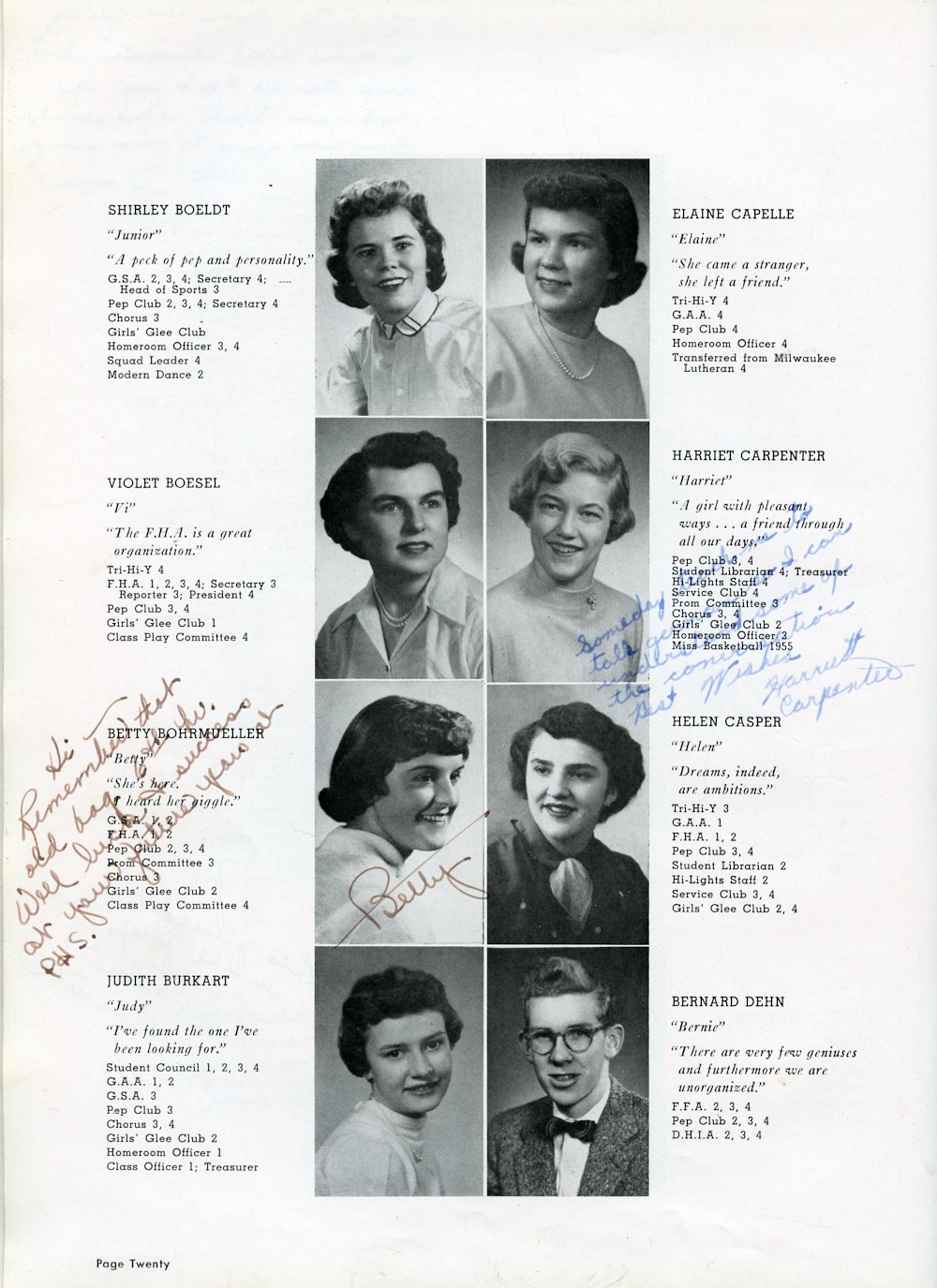 1955 Plymouth High School Yearbook Page 20: Shirley Boeldt, Violet Boesel, Betty Bohrmueller, Judith Burkart, Elaine Capelle, Harriet Carpenter Helen Casper, Bernard Dehn.