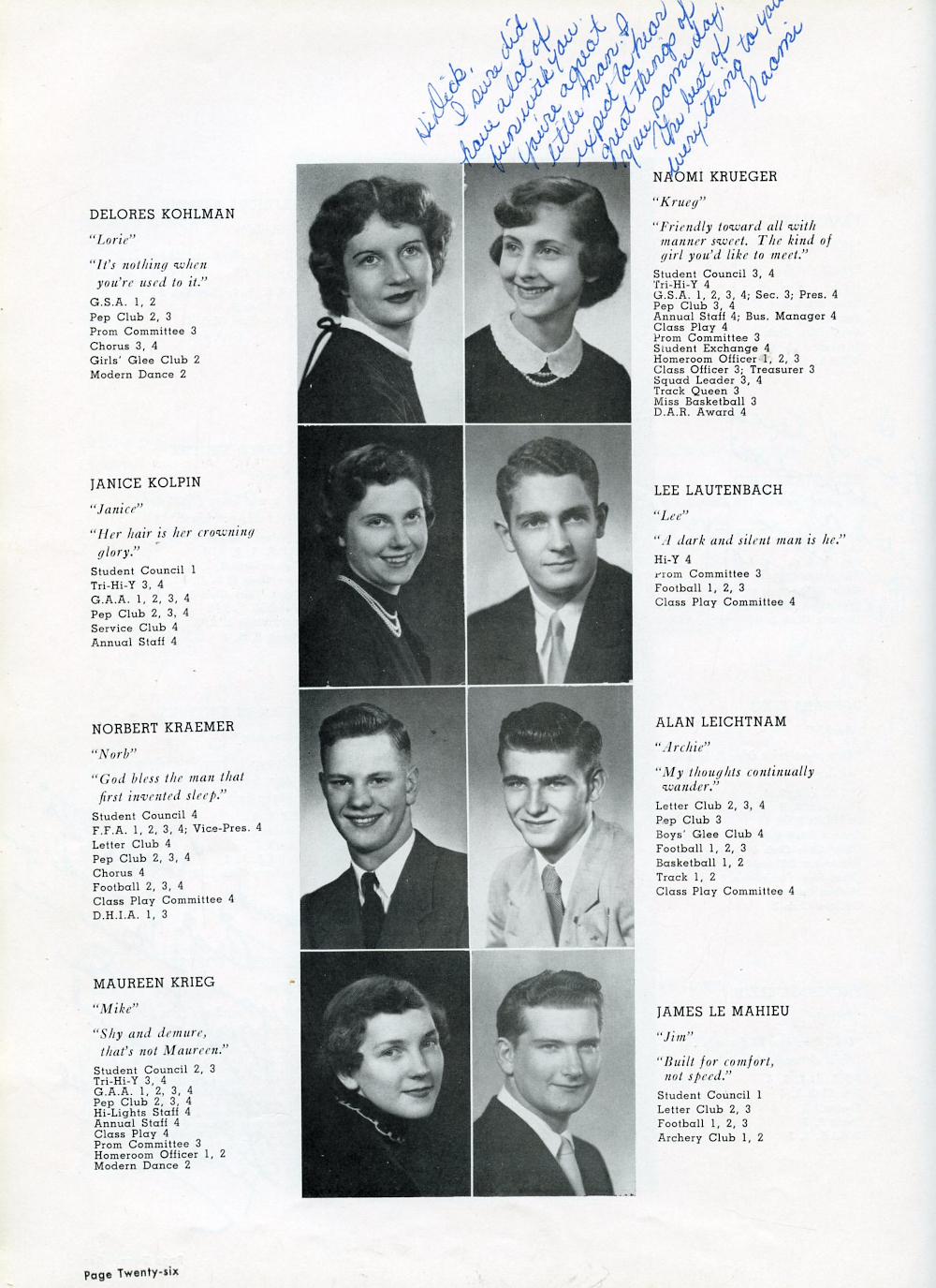 1955 Plymouth High School Yearbook Page 26: Delores Kohlman, Janice Kolpin, Norbert Kraemer, Maureen Krieg, Naomi Krueger, Lee Lautenbach, Alan Leichtnam, James Le Mahieu.